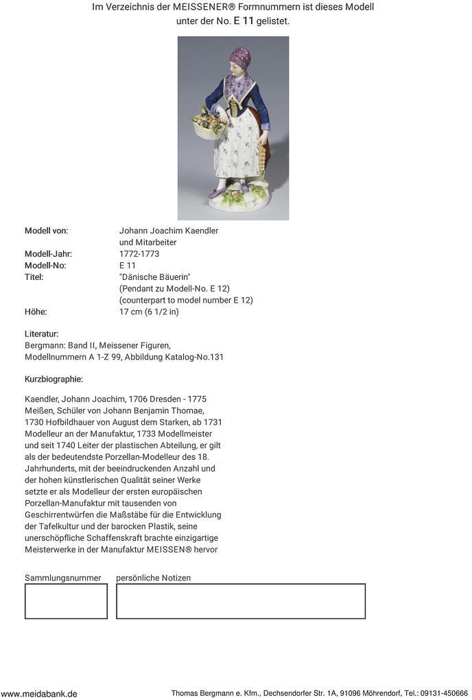 Model by Johann Joachim Kaendler and co-workers 1772-1773. Painted in color, gold painted. Pendant to "Danish Farmer" (model no. E 12). Incised mark, impressed mark, painter's mark, sword mark. Handle, vegetables restored.
