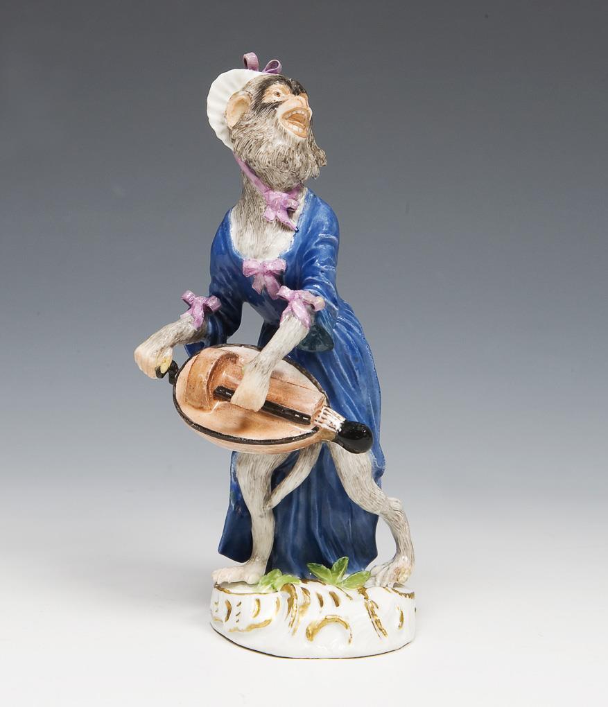Model year: 1753. Painted in color, painted gold. From the "Monkey Chapel" series of 21 figures and music stand. Unglazed base, sword mark on the plinth. Slips partially restored, thumb, two toes, knob of the hurdy-gurdy.