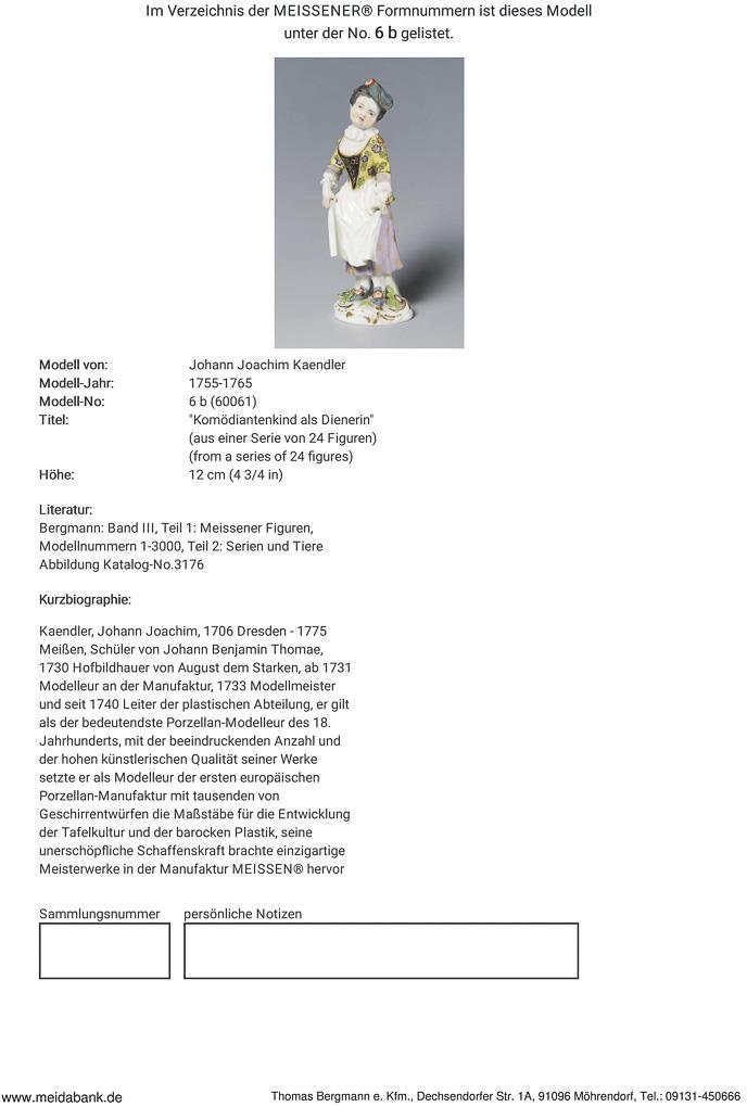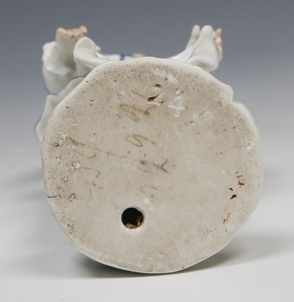 Model year: 1755-1765. Painted in color, painted gold. Pendant to "Komödiantenkind als Diener" (model no. 6 a), from a series of 24 figures. Unglazed base with formerly faded sword mark, impressed mark. Hat bow, one shoe tip minimally chipped, small fire crack on the forehead.