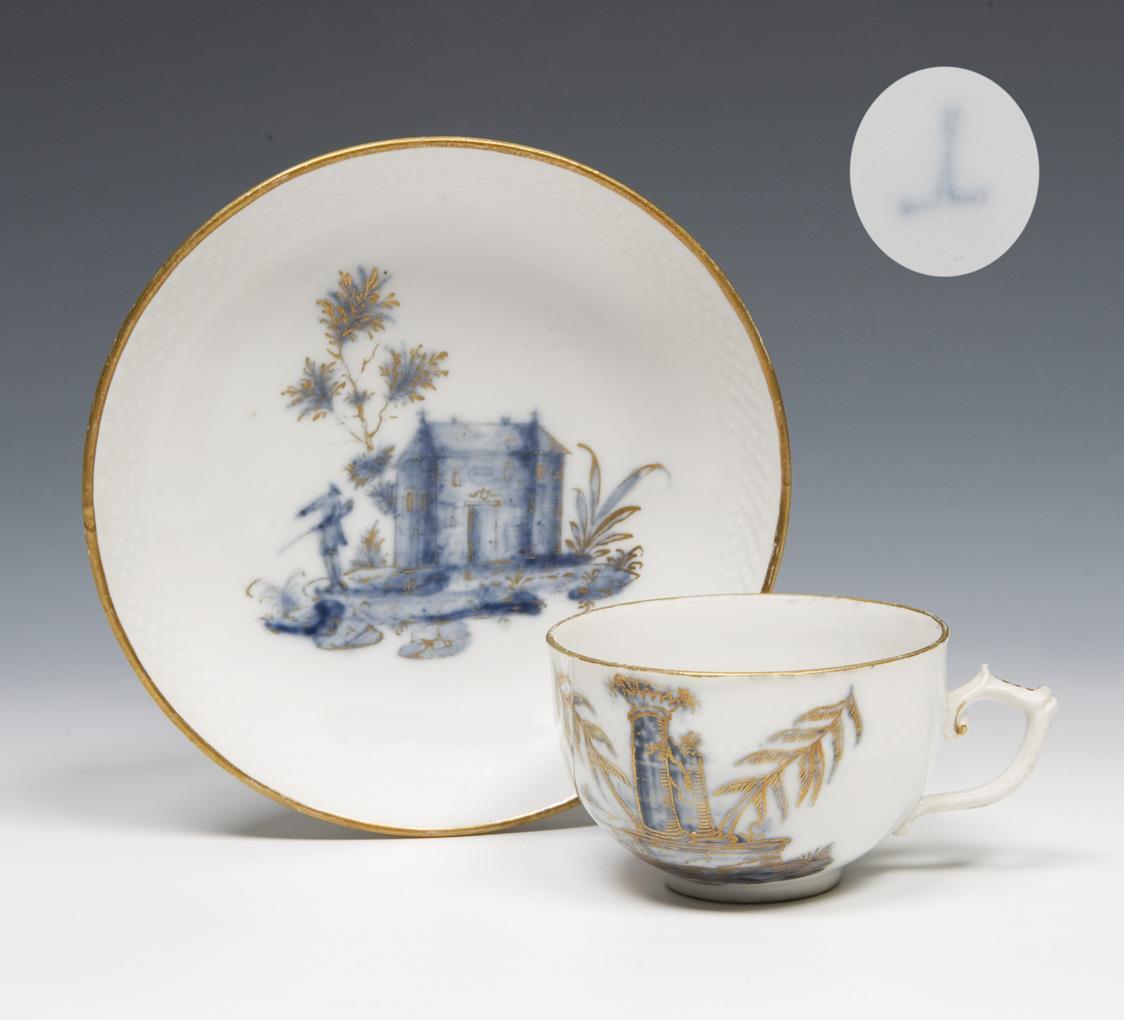 Relief-decorated rim, cobalt blue underglaze painting, overglaze painting in gold. "Architectural landscapes" on cup and saucer, gold staffage. Underglaze blue bottom marks. Handle restored.