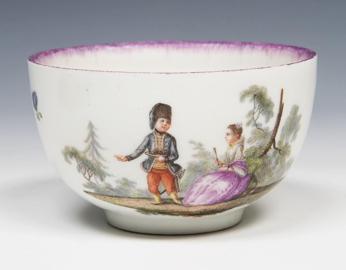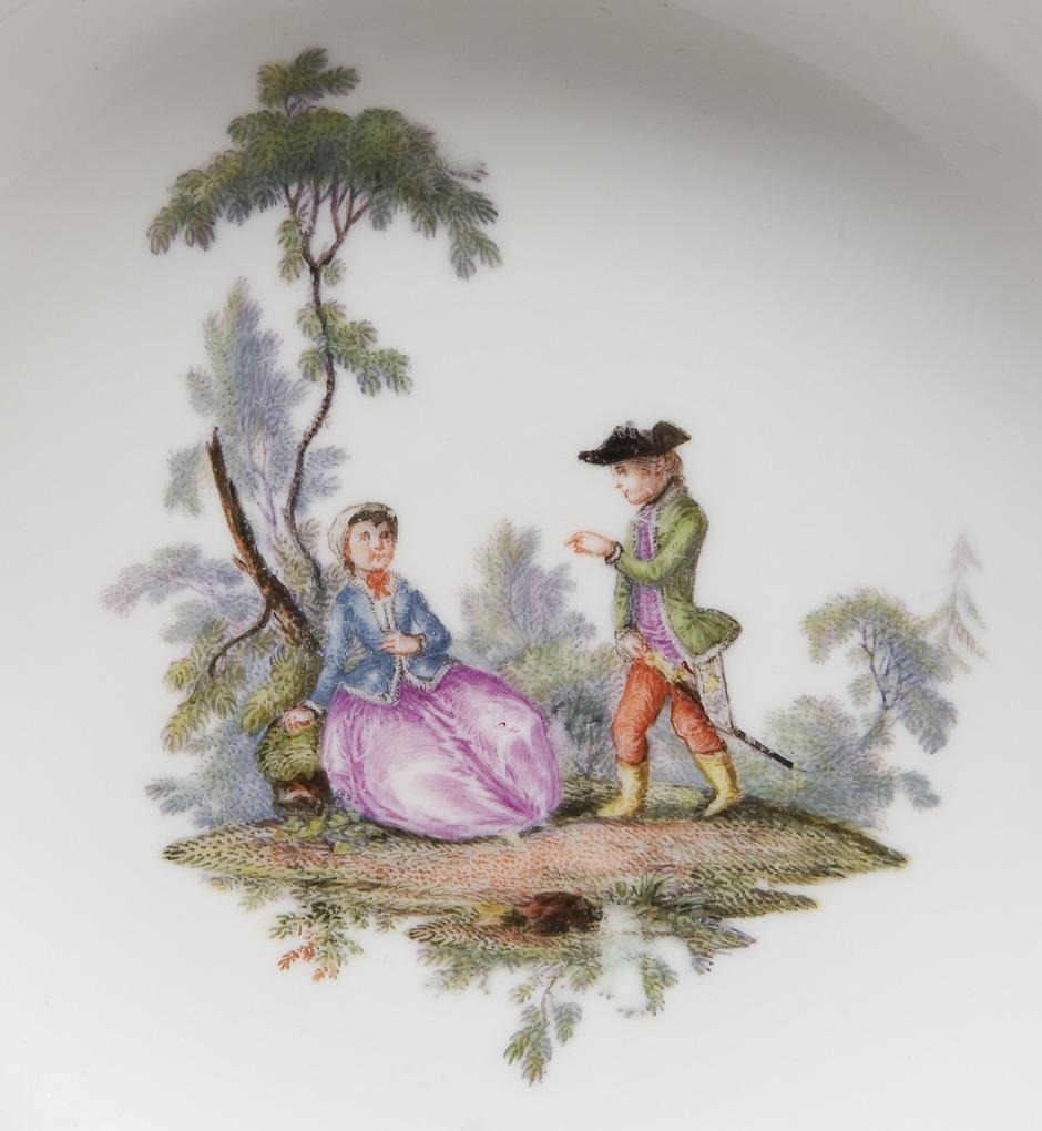 The manufactory gradually acquired over 230 engravings with so-called Watteau motifs. The engravings were never completely copied, only individual figures or details were used, thus creating new images and each piece is an original * Partnerauktion Bergmann.