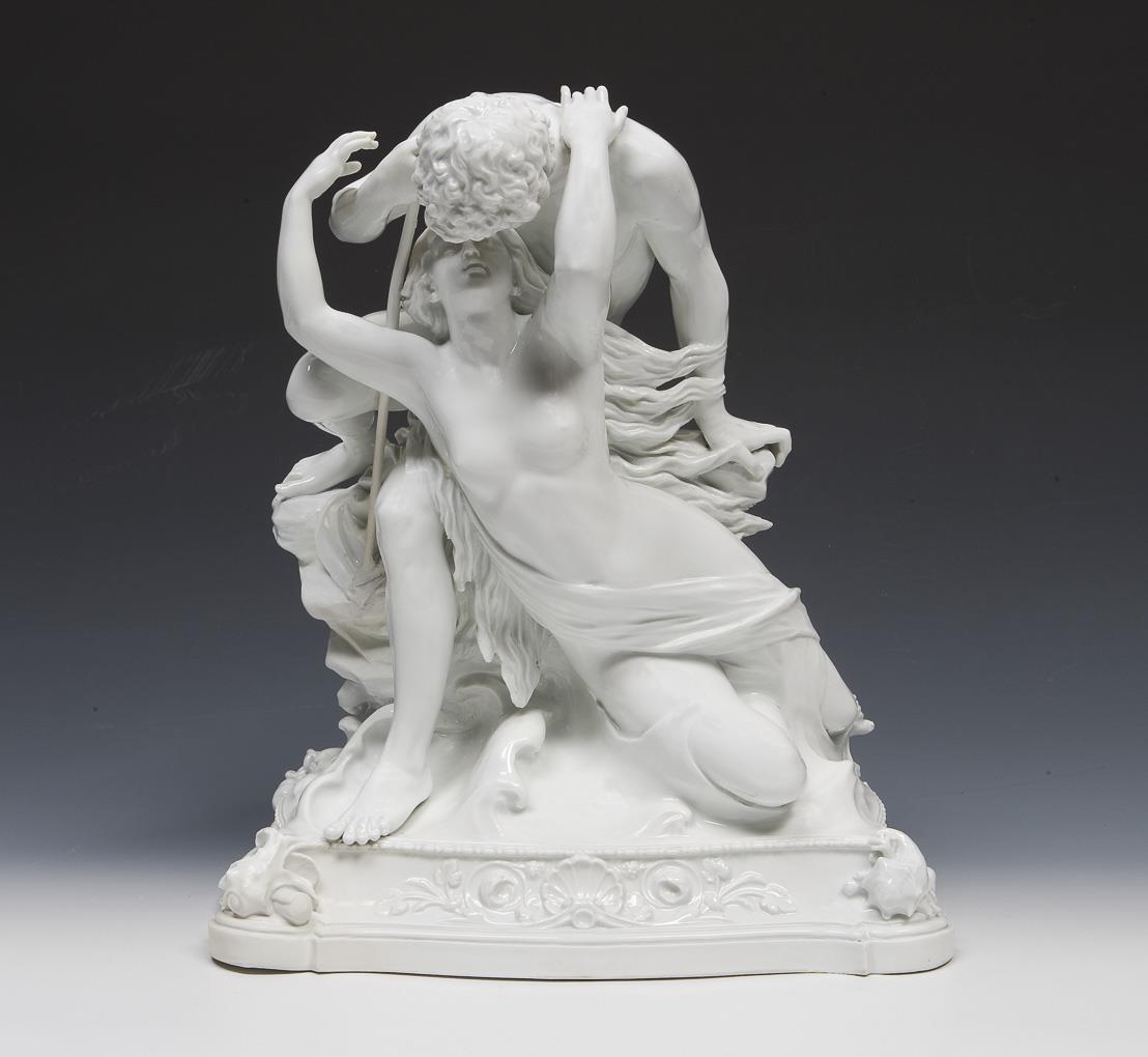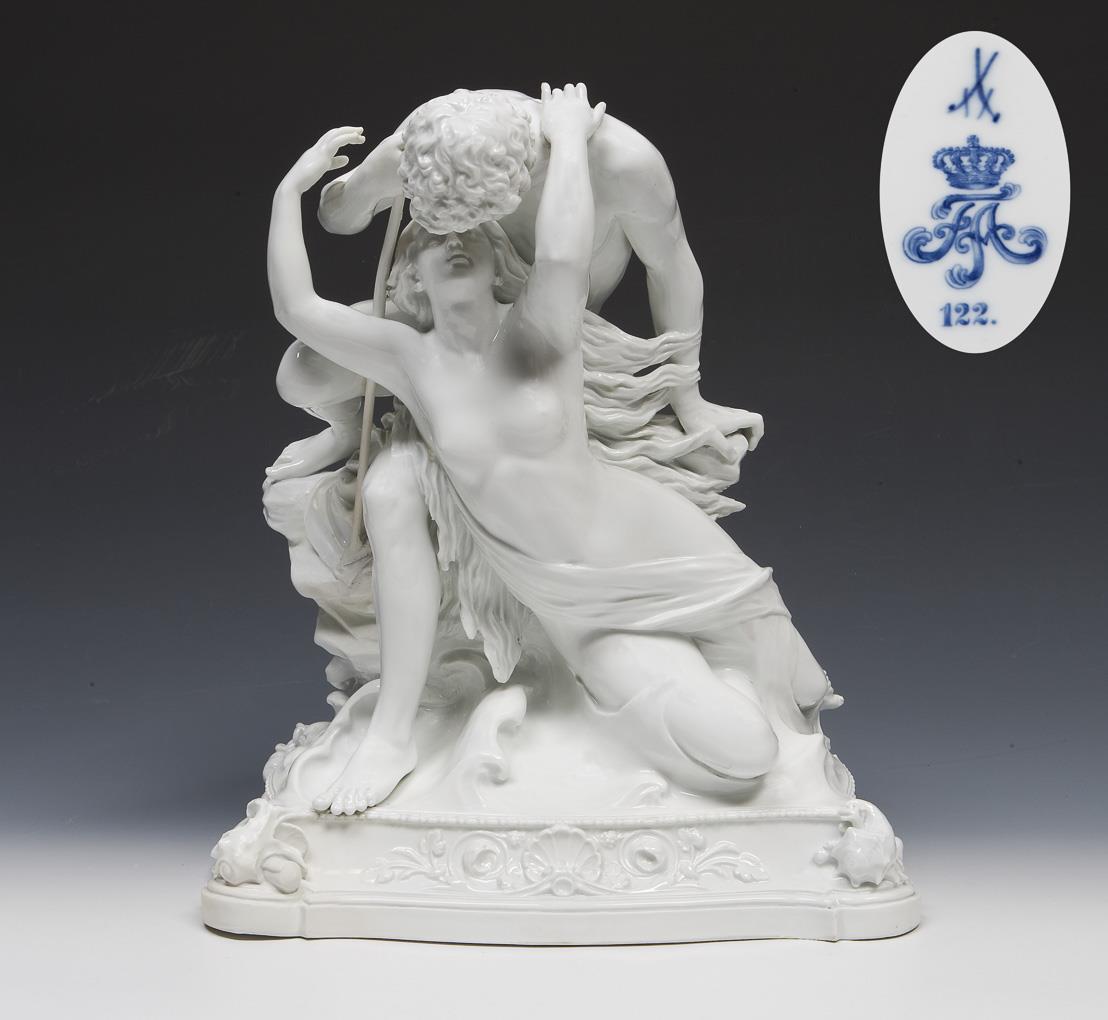 Rare large figurine group from the estate of King Frederick Augustus III: Fisherman and mermaid. Meissen.