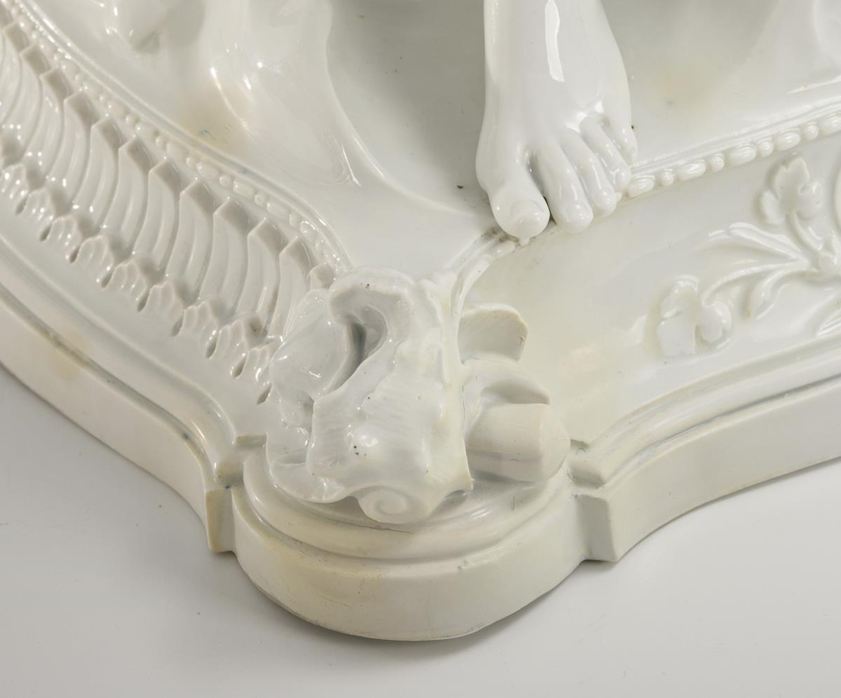 Model year: 1886. White porcelain. Incised mark, pressed mark, sword mark, crowned underglaze blue monogram FA with (inventory no.) 122 of King Friedrich August III. The group in life-size Carrara marble is in Hamburg, Stiftung Historische Museen, Jenisch Haus. Originally commissioned for the palace of the Donner family of merchants and bankers in Hamburg, it came to the museum as a gift from Baron Conrad Hinrich von Donner. One corner of the base, the lower rod (visible), two small edges of the base, two toes partially restored, the restored corner of the base from below, one edge of the cloth (minimally) bumped, end of the rod missing, small glaze defects in places, firing cracks. Upper end of the rod and fingers of the fisherman's right hand with old spray residue, which can be scraped off.