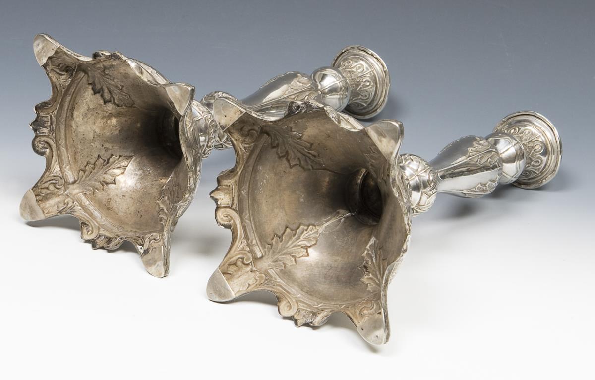 Single-flame candelabra with baluster shaft. Surrounded by ornamental and floral decoration in relief. Discreetly engraved monogram on the base. Hallmarks: Monogram GK, fineness tested with acid. Dripping bowls with dents, shaft partially with cracks.