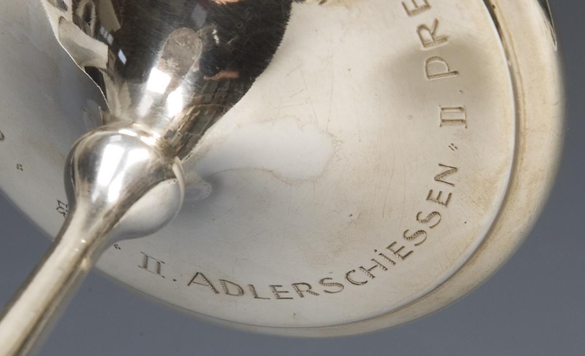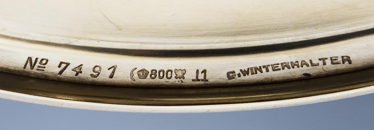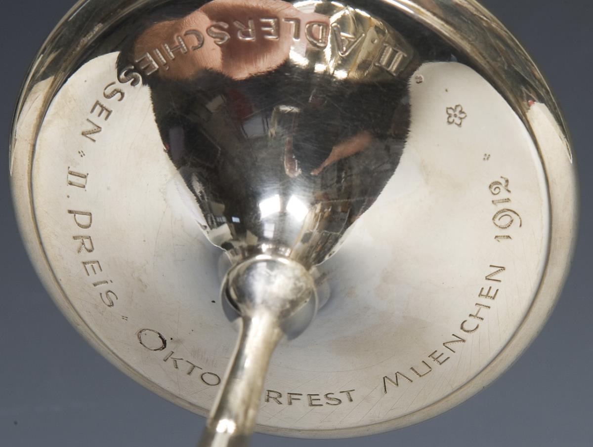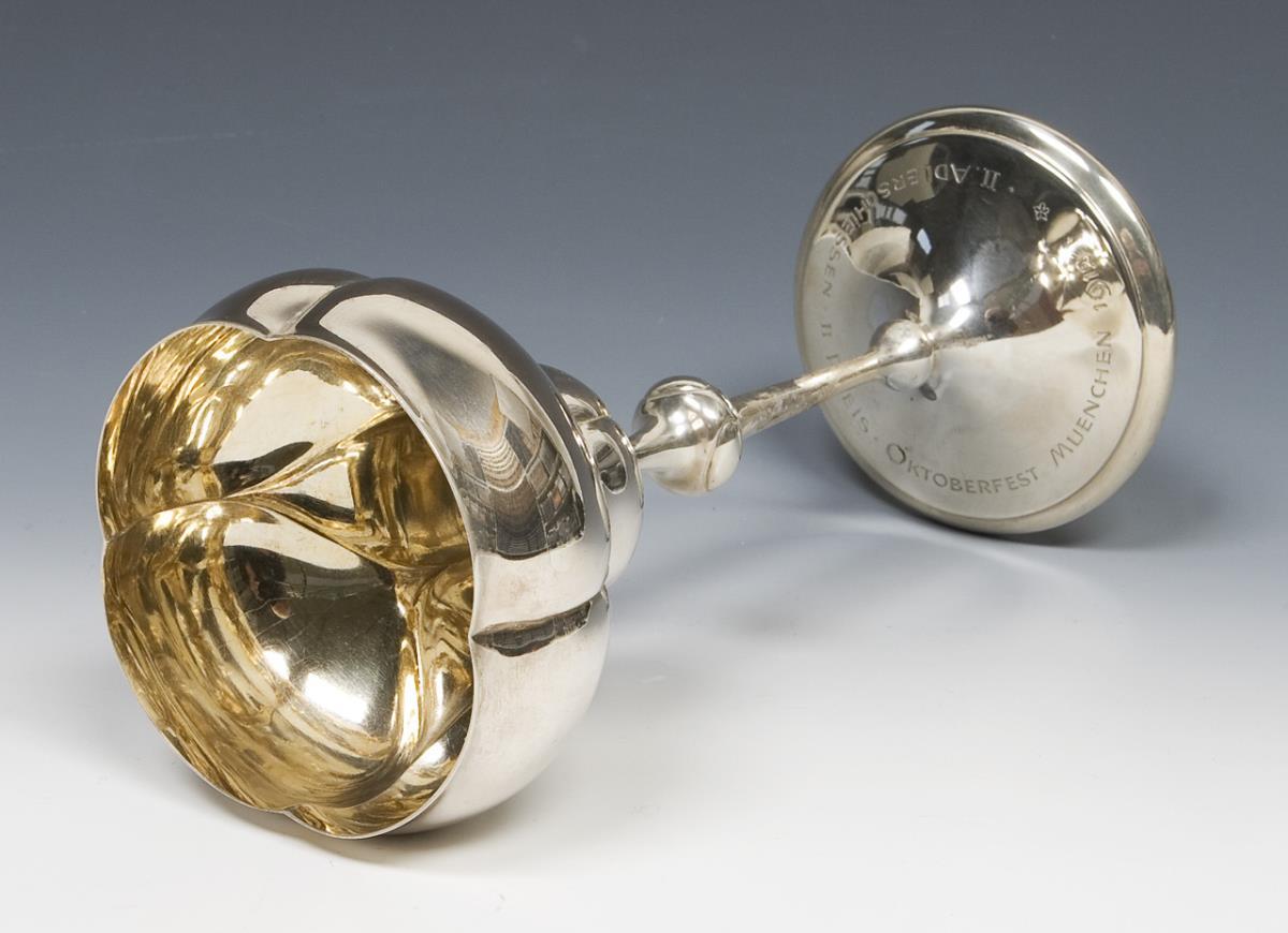 Quadripartite curved bowl in the stylized shape of a columbine. Engraved dedication on the base: "Oktoberfest Munich 1912, II Eagle Shoot, II Prize". Hallmarks: Crescent and crown, fineness, factory mark, signature G. Winterhalter.