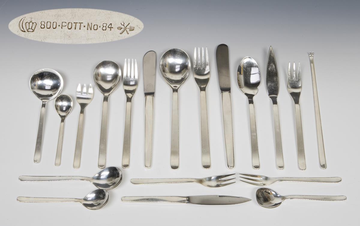 Model by Carl Pott 1952, the so-called "Kanzlerbesteck". Model no. 84. 334 pieces: 18 knives, 18 forks, 18 tablespoons, 38 dinner knives, 38 dinner forks, 34 dinner spoons, 18 dessert forks, 18 demitasse spoons, 16 coffee spoons, 12 lobster forks, 14 fish knives, 14 fish forks, 7 fruit knives, 7 fruit forks, 6 dessert spoons, 10 cake forks, 6 ice cream spoons, 6 gourmet sauce spoons, 1 soup ladle, a 2-piece salad servers, 1 serving spoon, 2 asparagus servers, 2 fish serving knives, 2 fish serving forks, 2 large, 4 medium, 3 small serving forks, 4 butter knives, 3 sauce ladles, 6 dessert serving spoons, 2 flat serving spoons, 2 molded serving spoons. Design classics, solid, high-quality work. In addition to Ludwig Erhard's Chancellery, almost all German embassies were equipped with this cutlery. Knives with rustproof Solingen stainless steel blades. Hallmarks: Crescent and crown, fineness, factory mark.