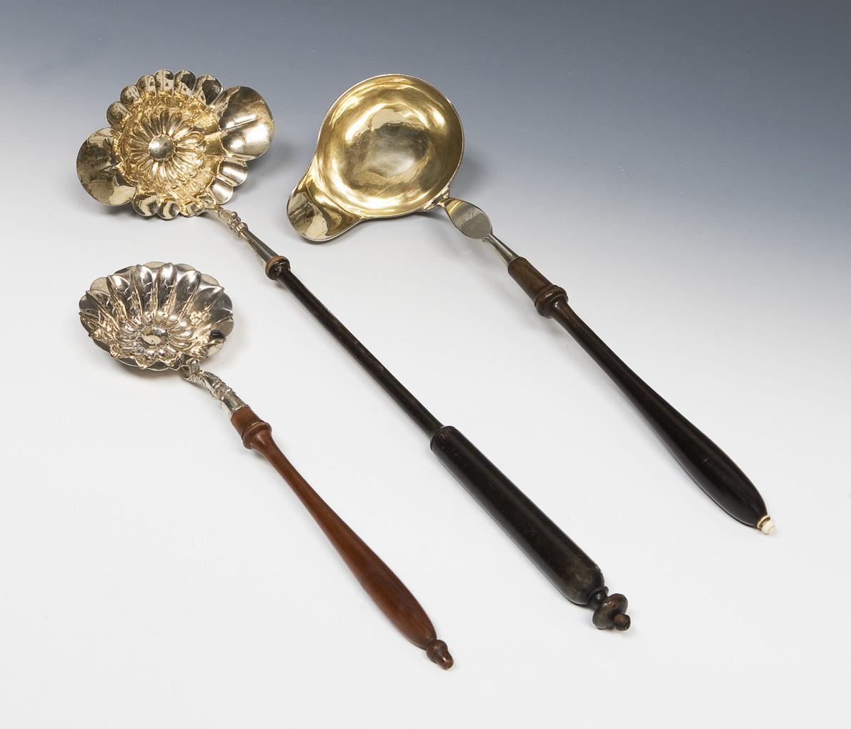 One ladle with engraved monogram, dated: 1848, gilded inside. Strainer ladle with indistinct city mark. Godroned ladle with Nuremberg city mark, master's mark. All ladles with hallmark.