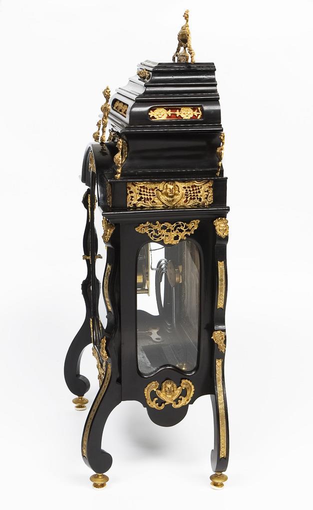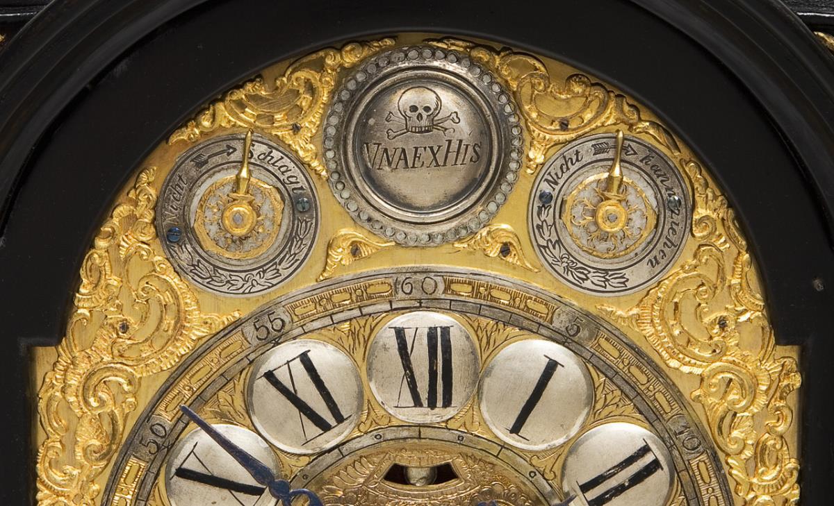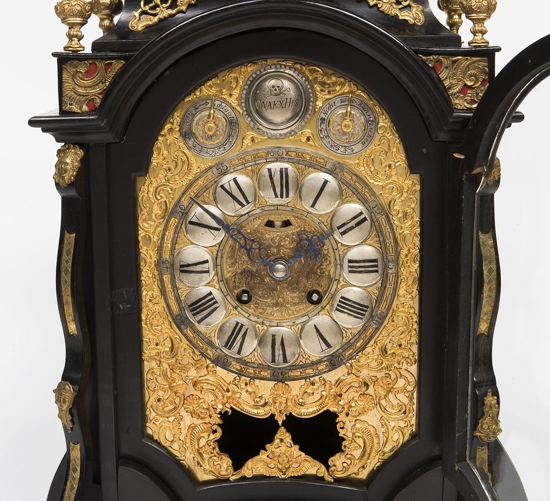 Blackened wooden case, curved on all sides, glazed on three sides with figural, floral and ornamental applications in the style of Leopold Hoys (1713 Vienna - 1797 Bamberg, 1741 master clockmaker). Dial with stop device for former striking mechanism and repeater, engraved skull "UNA EX HIS" in the center, pendulum window, Roman hour cartouches, chapter ring with Arabic minute track. Striking mechanism on gong with pendulum on spring suspension added in the 19th century. Restored with additions, front window missing.