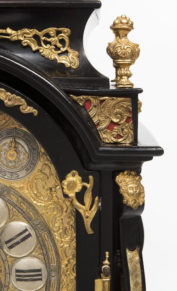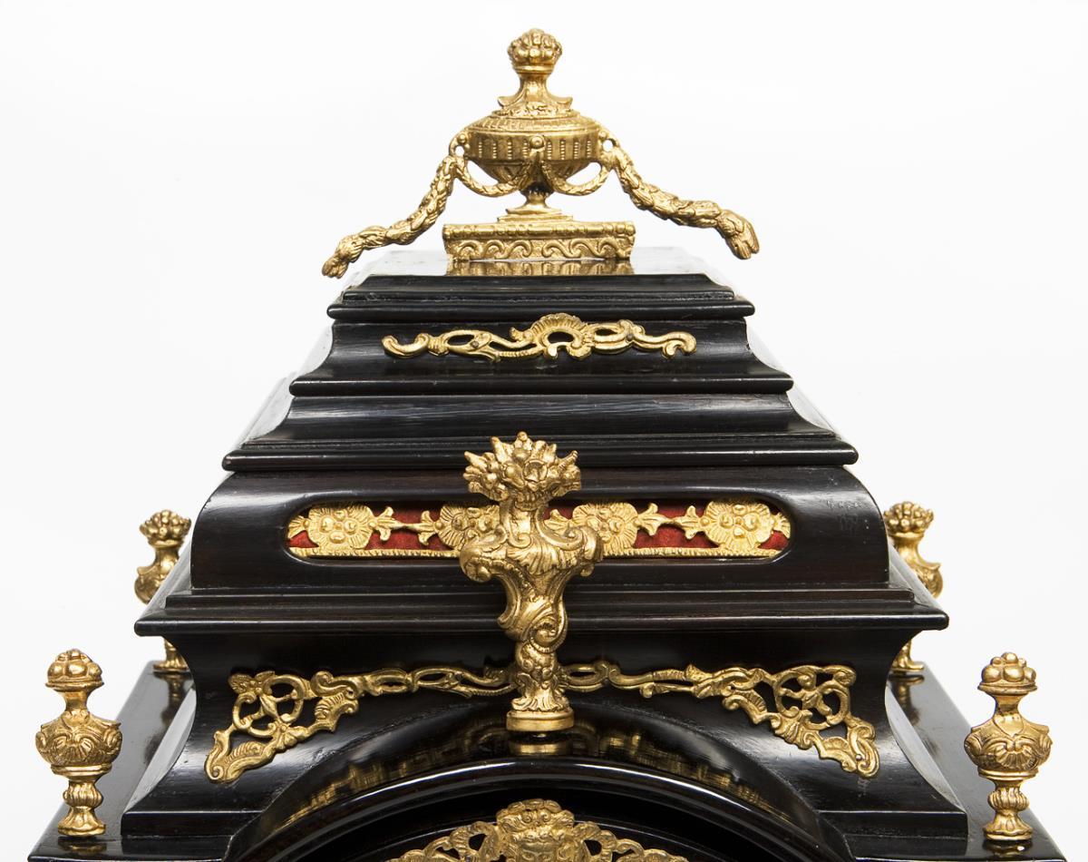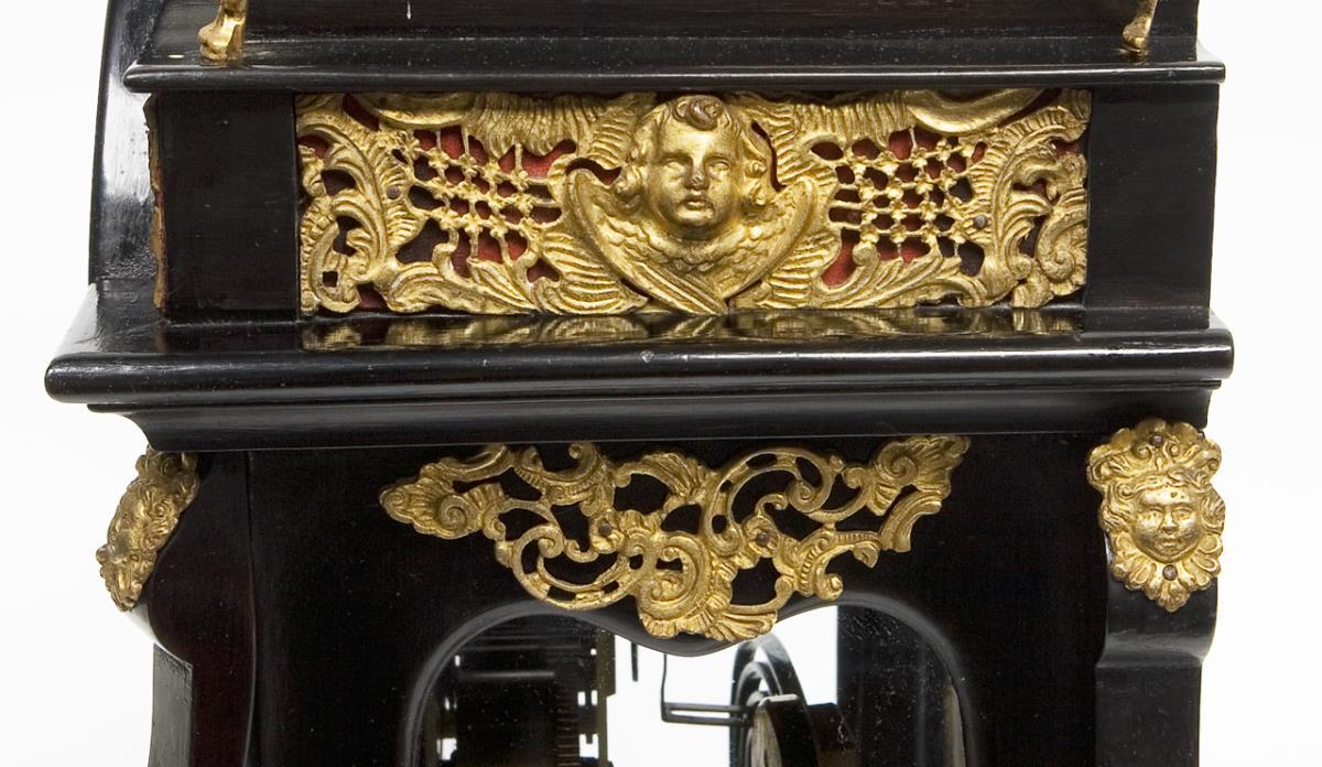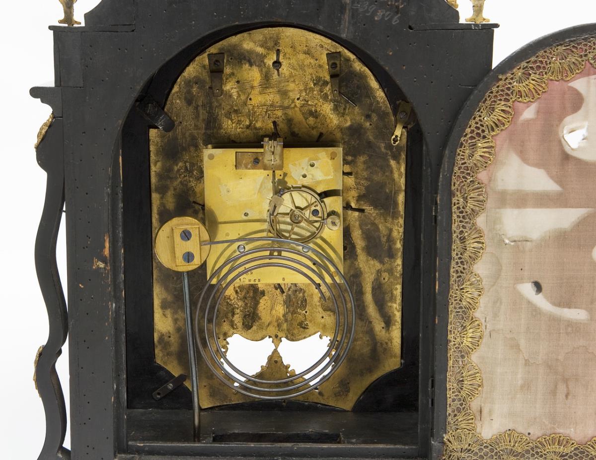 Blackened wooden case, curved on all sides, glazed on three sides with figural, floral and ornamental applications in the style of Leopold Hoys (1713 Vienna - 1797 Bamberg, 1741 master clockmaker). Dial with stop device for former striking mechanism and repeater, engraved skull "UNA EX HIS" in the center, pendulum window, Roman hour cartouches, chapter ring with Arabic minute track. Striking mechanism on gong with pendulum on spring suspension added in the 19th century. Restored with additions, front window missing.
