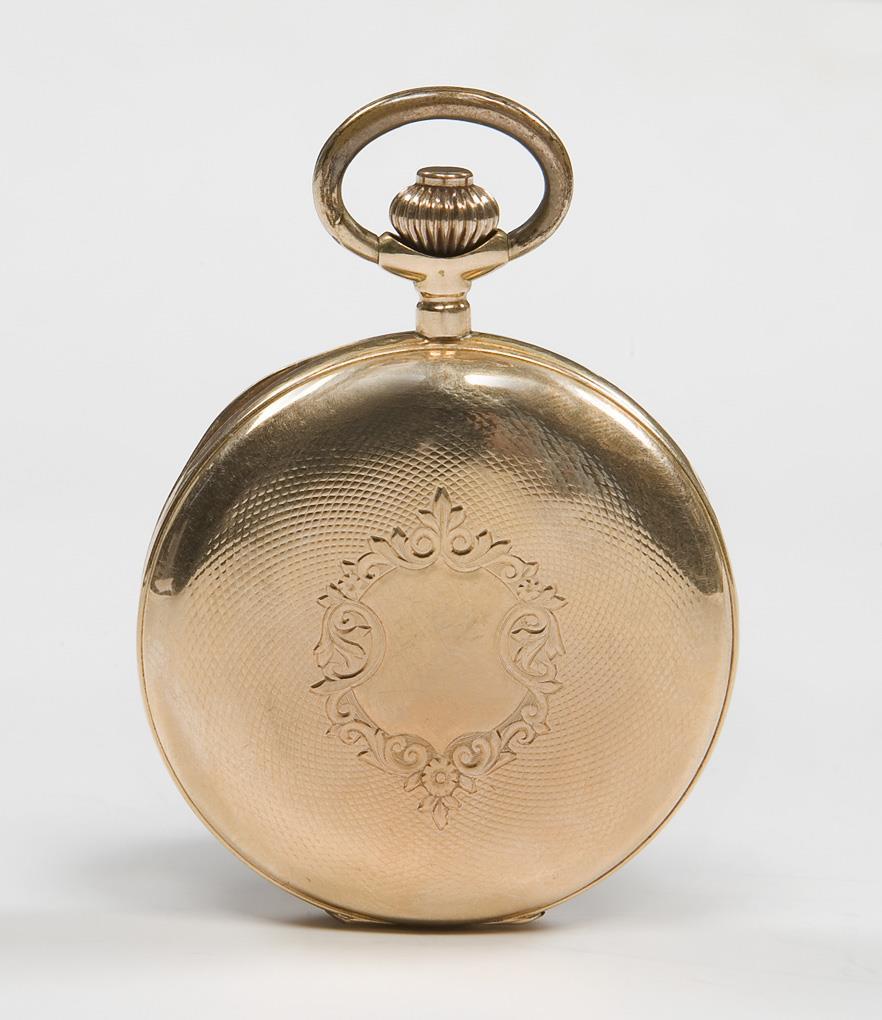 Guilloché case with engraved cartouche, metal inner cover. Bridge lever movement, white enamel dial, black Arabic numerals, small second, crown winding mechanism. Functional in the short-term test. Case slightly dented, dial partially defective at the edge.