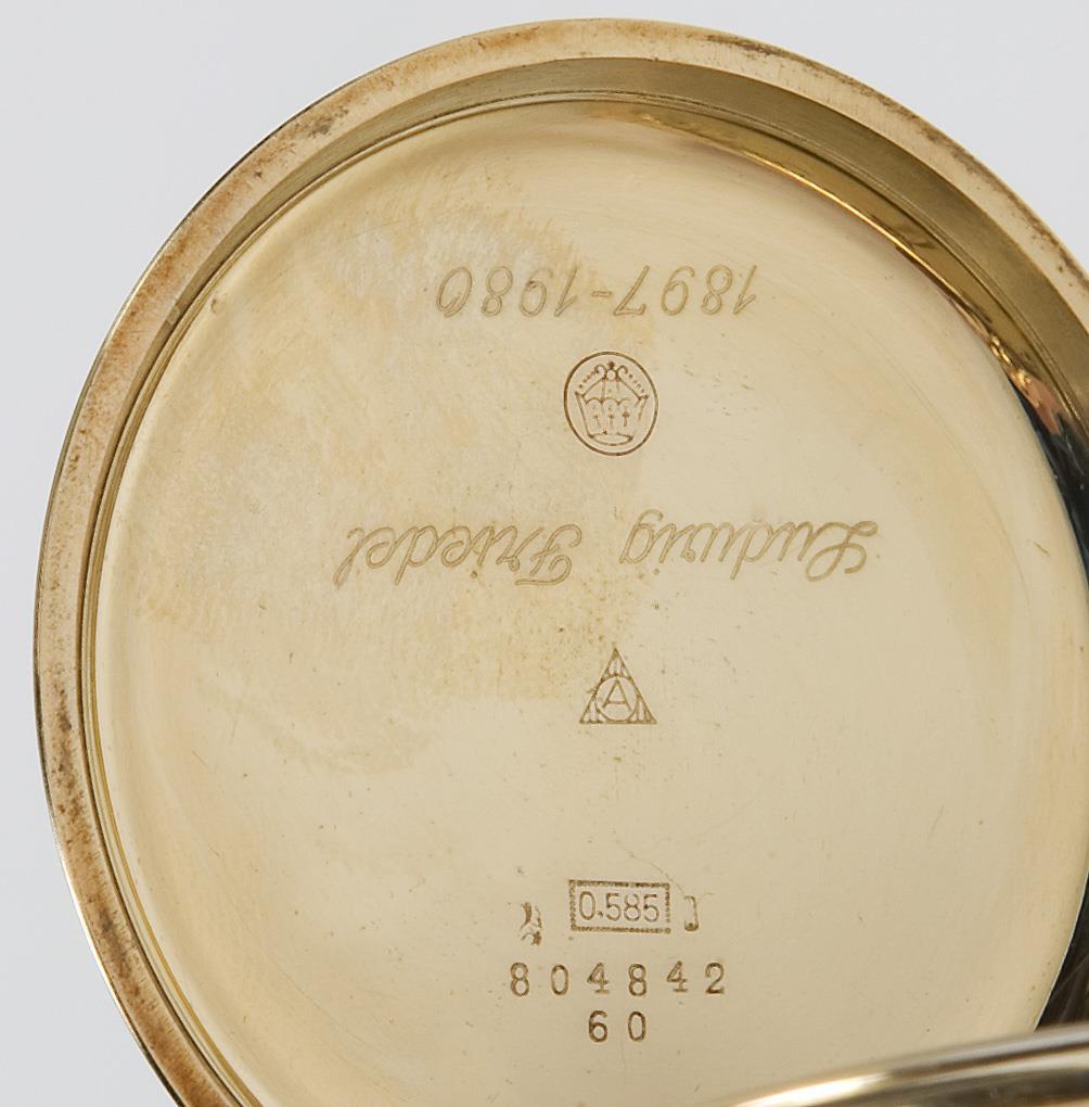 Case, dial, movement signed. Case with diamond decoration, metal inner cover, gold dial, Arabic numerals, small second, Breguet hands. Bridge lever movement with Geneva stripes, caliber 273 A, crown winding. Commemorative dedication engraved in the lid: Ludwig Friedel 1897-1980. Functioning in the short-term test.
