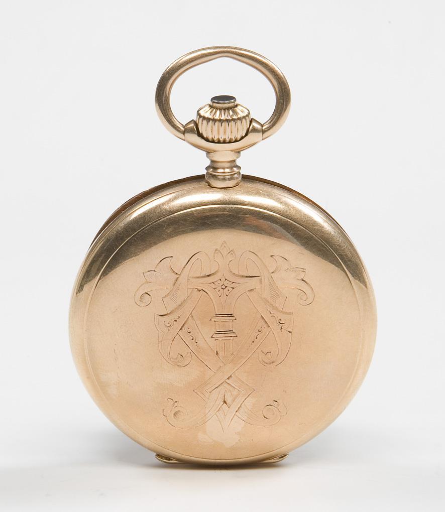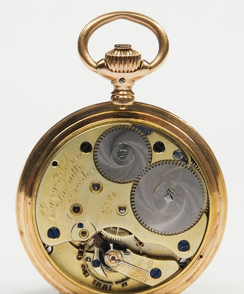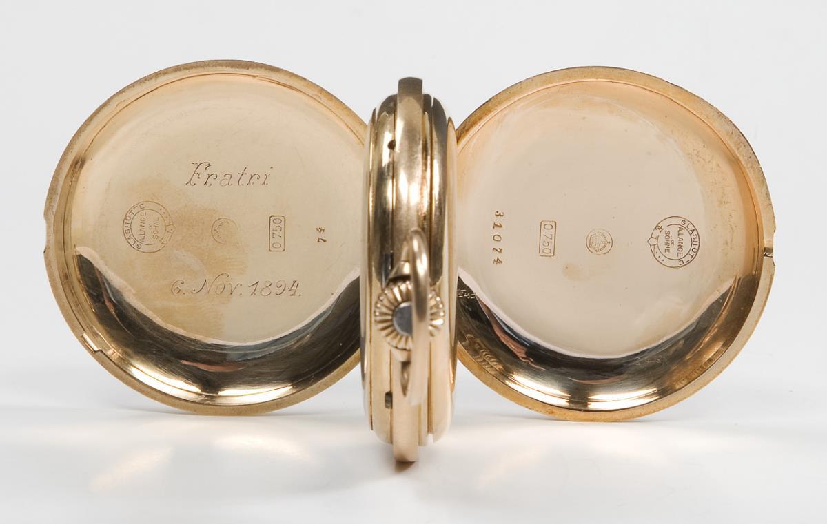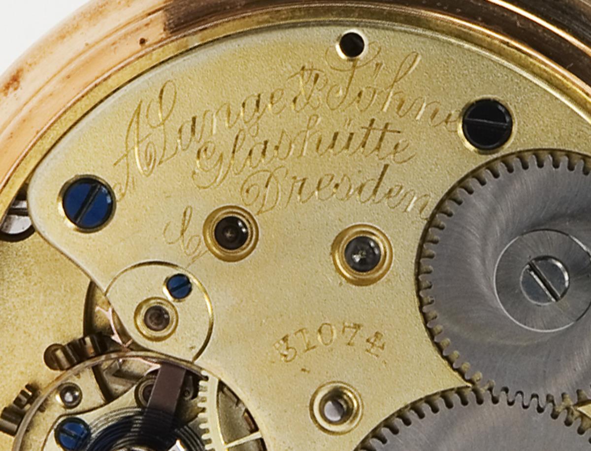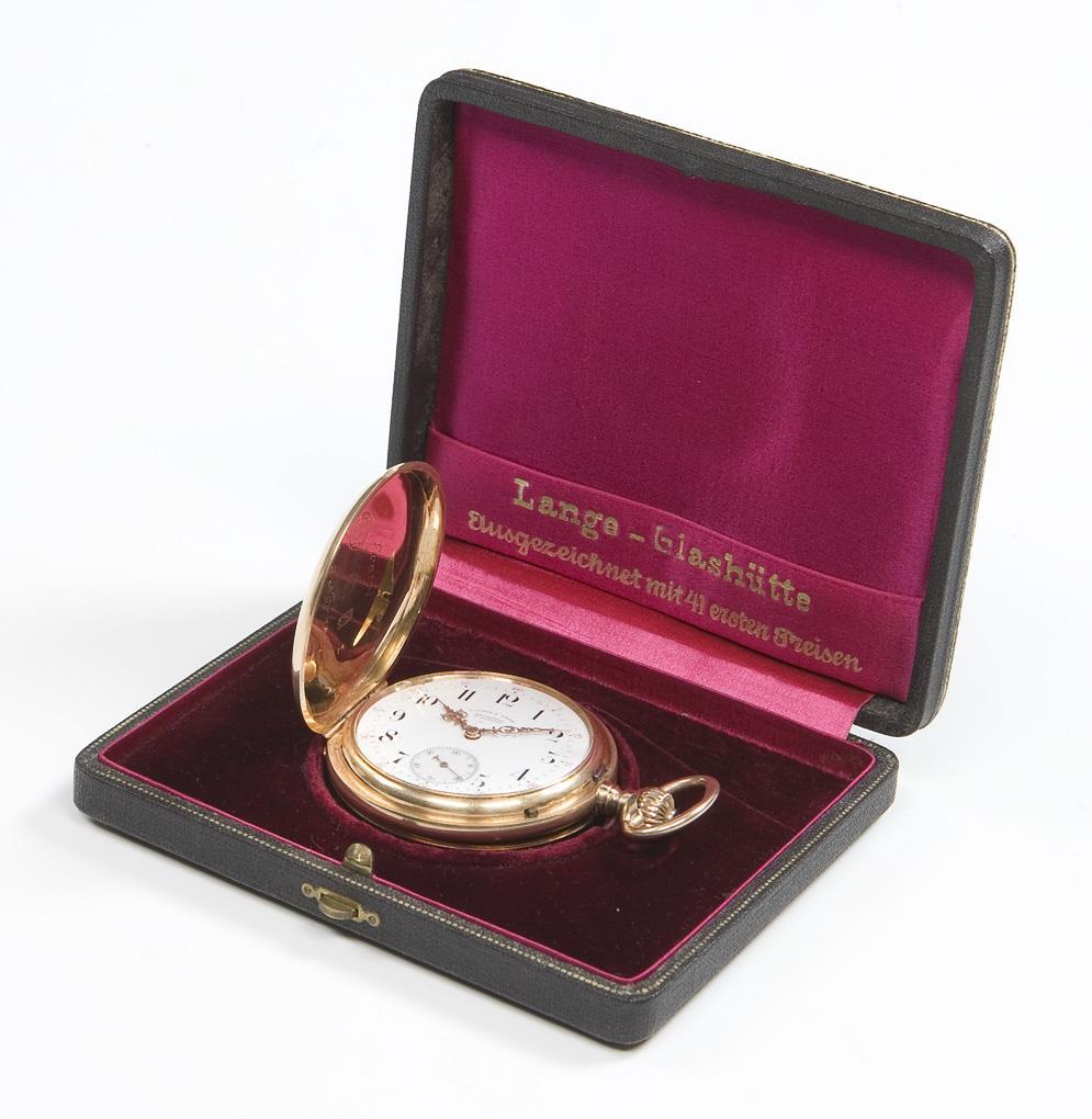 Dial, case, movement signed. Frontally engraved case, gold inner cover. Gilt three-quarter plate lever movement with blued steel screws, crown winding. White enamel dial, black and red Arabic numerals, open-worked hands, small second. Date engraved on the cover: Fratri (Latin for brother) Nov. 6, 1894. Case: "Lange-Uhr-Glashütte", "Lange-Glashütte, ausgezeichnet mit 41 ersten Preisen". Slight dents on the back, not in working order, balance staff not broken, but gummed up. Service required.