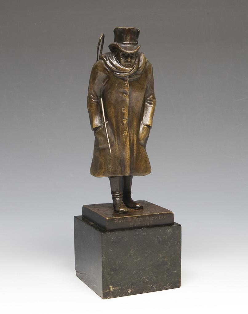 Standing figure with top hat, coat, scarf, boots and whip. Frontal dedication: Reit- und Fahrturnier Hof 1928, signed: A. Schley. Square serpentine stone plinth. Plinth minimally bumped.