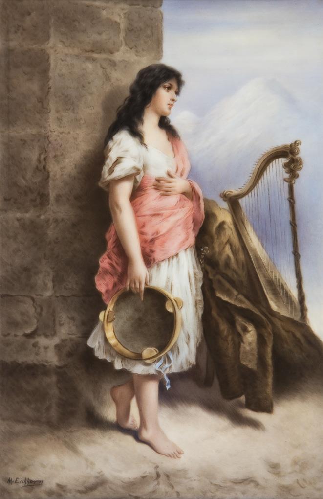 Mignon (French=irritating, "darling"), is a character from the novel by Johann Wolfgang von Gothe "Wilhelm Meisters Lehrjahre". Painted in color, signed by Max Eichhorn (porcelain painter, 1879-1961), based on the painting by Wilhelm Kray (1828 Berlin - 1889 Munich). Unglazed base, impressed marks. Bronze profile frame.