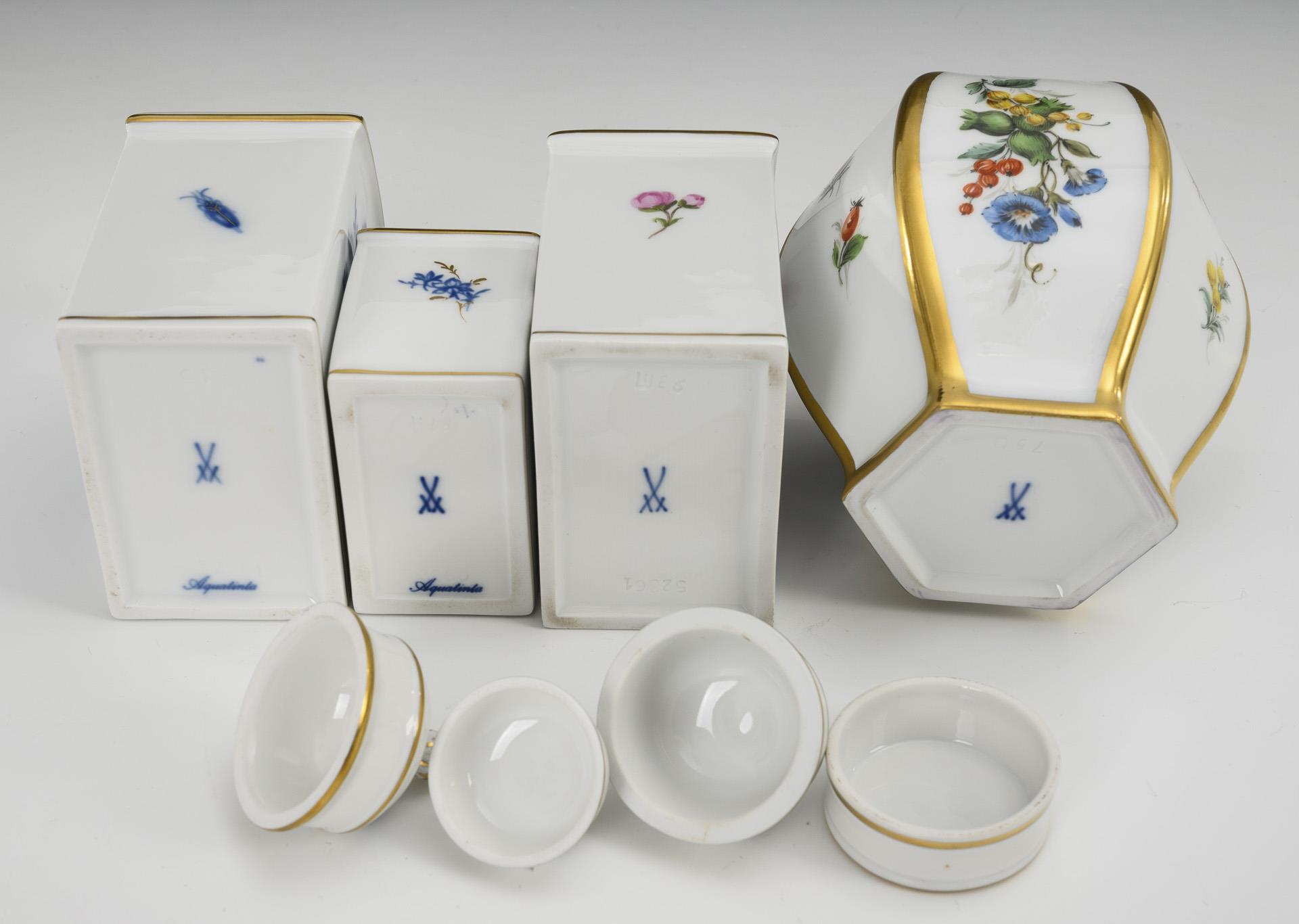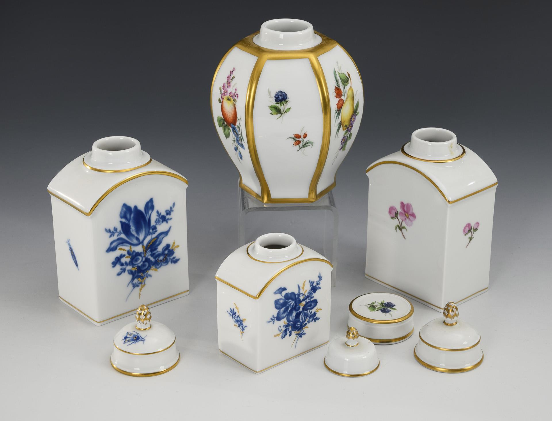 1x hexagonal baluster box with flower and fruit painting (h 12 cm). / 1x rectangular tea caddy with Usambara violets (H 13.5 cm). / 2 rectangular jars with aquatint decoration (H 9 and 13.5 cm).
