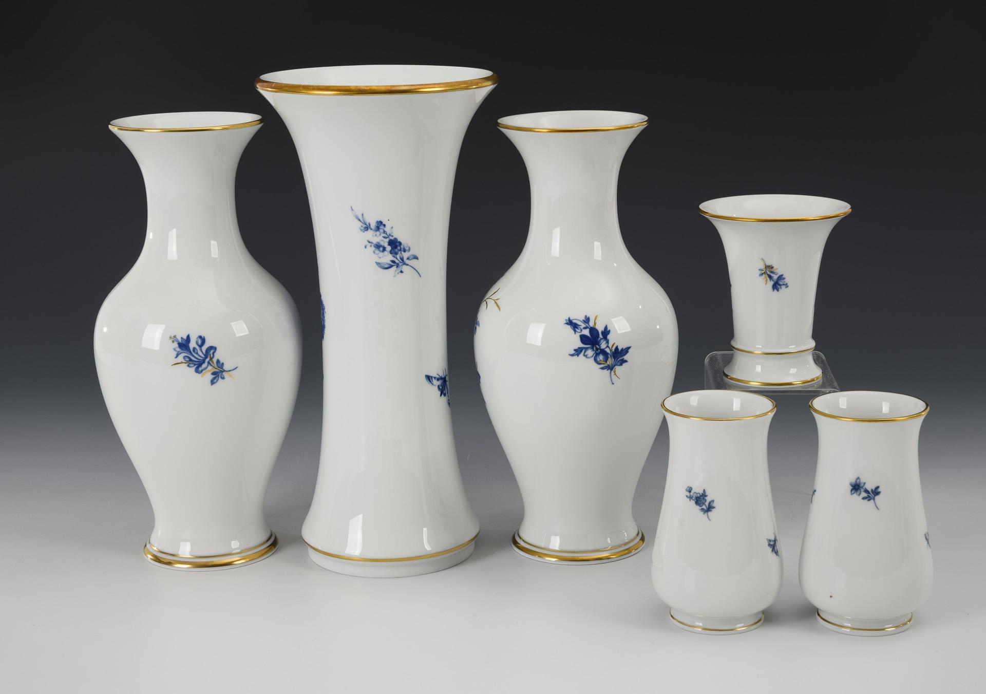 Flute vase (h 26 cm), 2 baluster vases (h 24.5 cm), 1 crater vase (h 9.5 cm) and 2 small baluster vases (h 11 cm).
