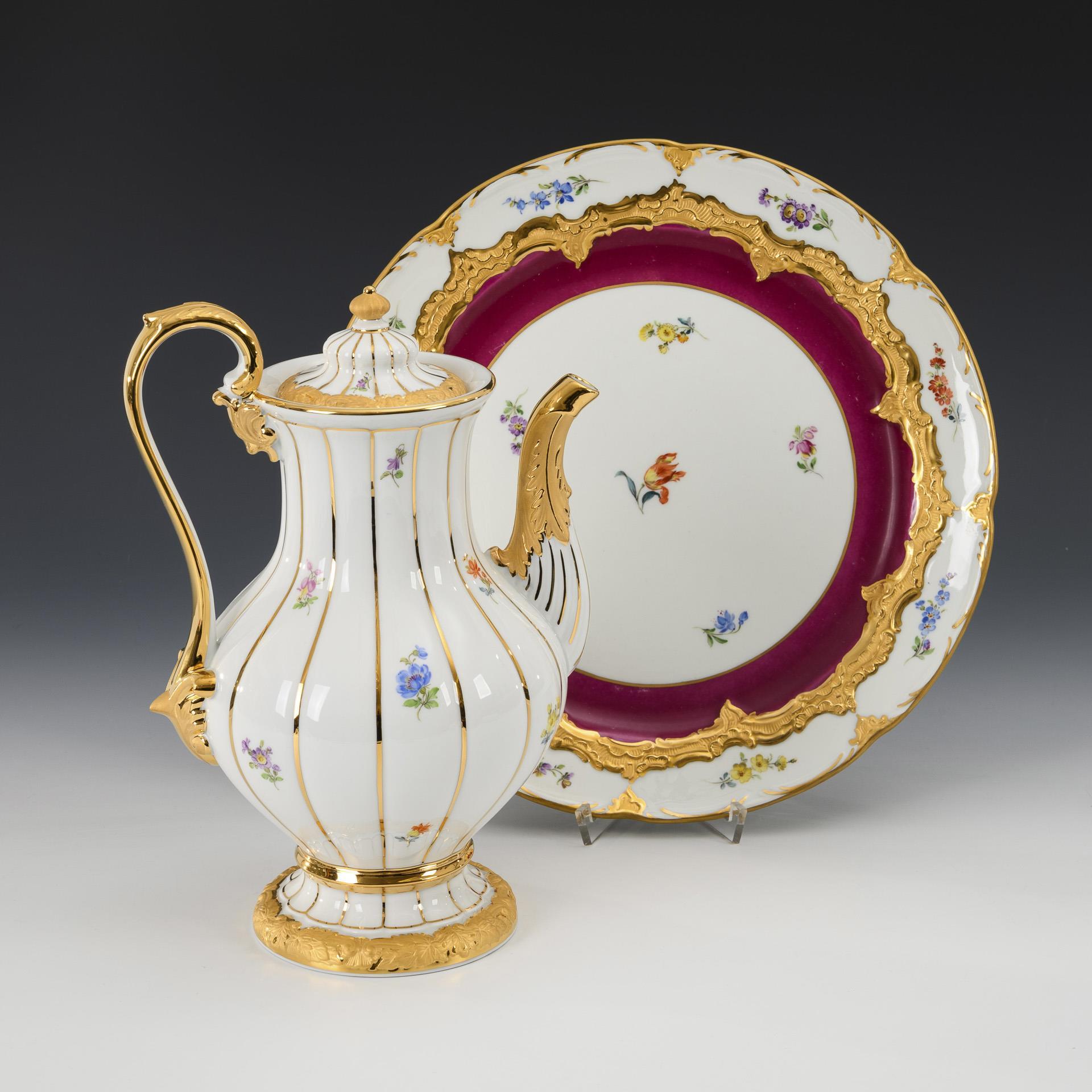 Cake plate and coffee pot with scattered flower painting. Meissen.
