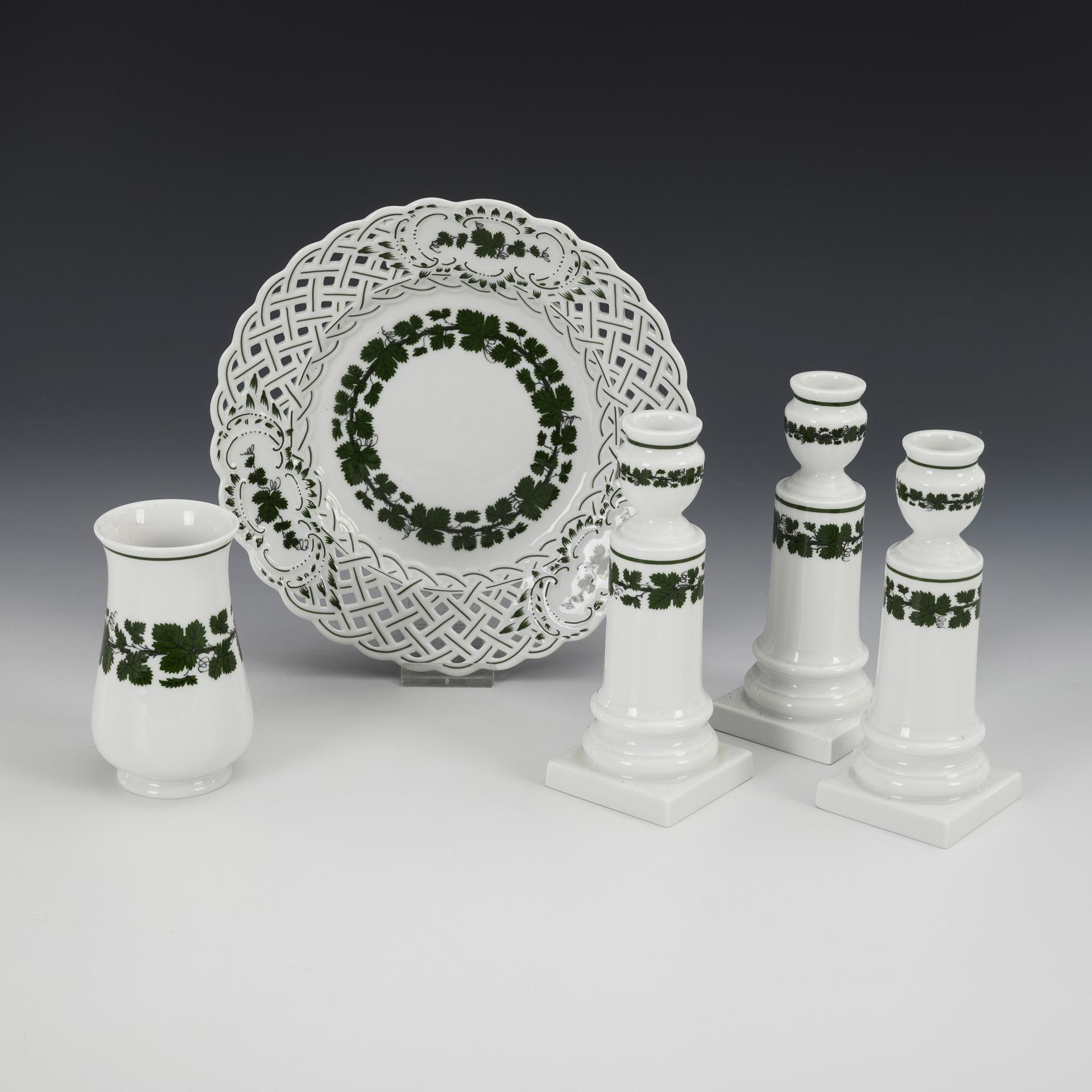 3 candlesticks, vase and pierced plate with vine leaf decoration. Meissen.