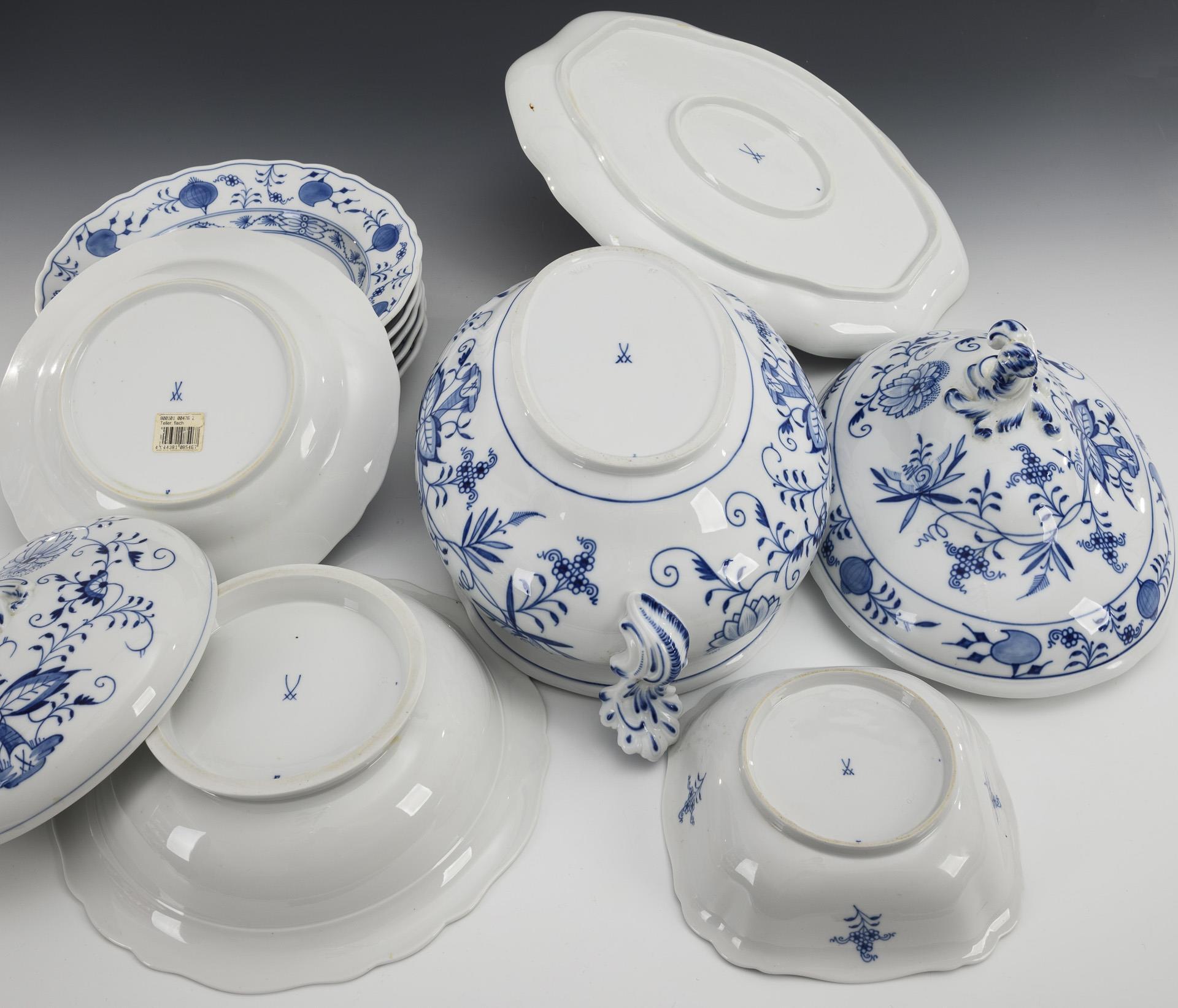 Oval tureen (H 28 cm), lidded bowl, tray ( L 37 x W 28 cm), potato bowl, 6 center plates.