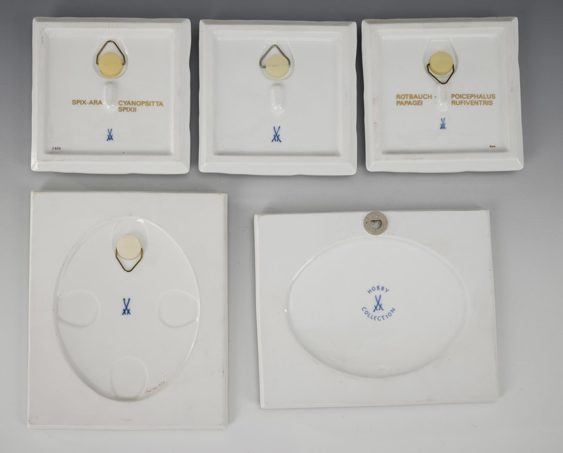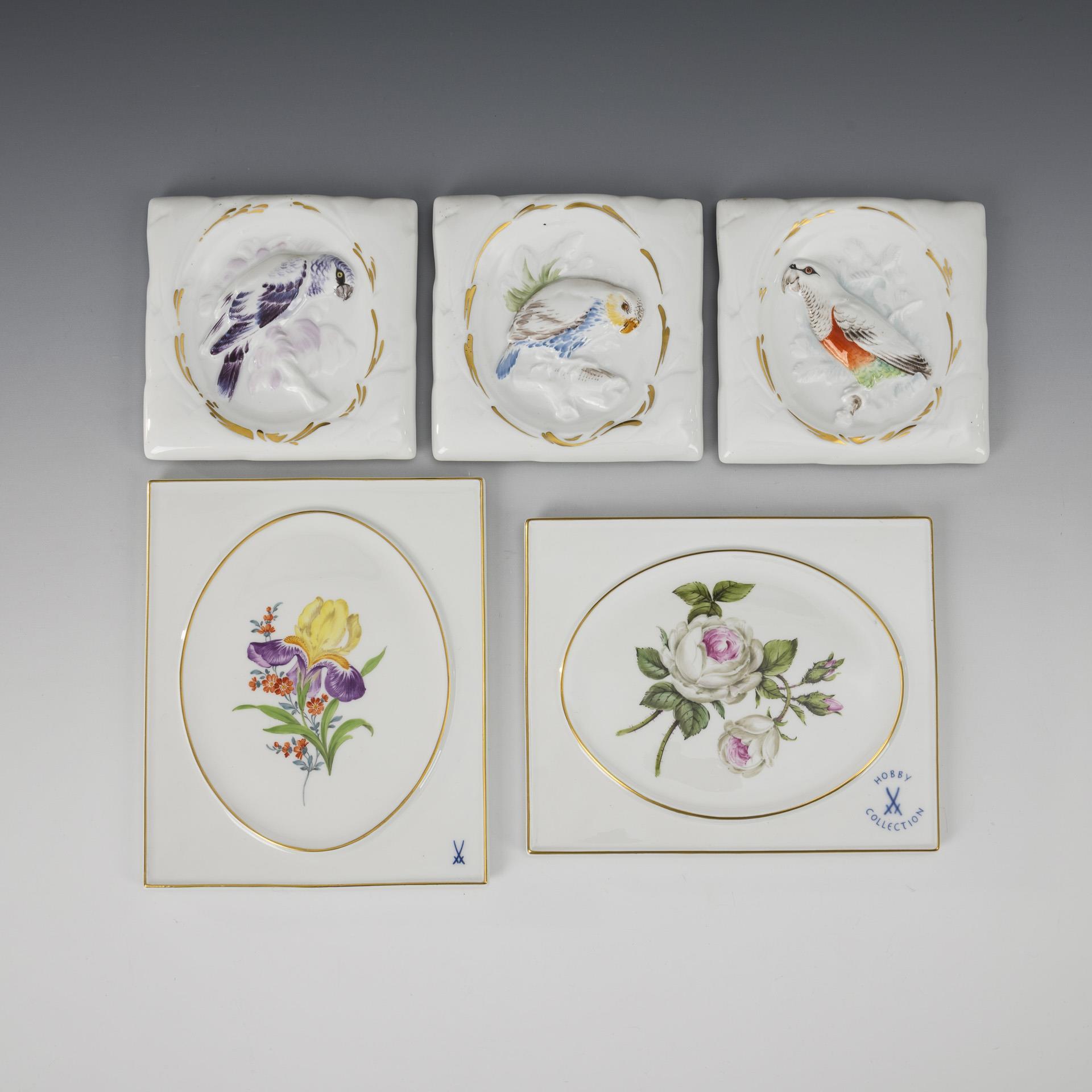 3 square wall reliefs (side length 12 cm) with Spix's macaw, red-bellied parrot and an unspecified parrot, as well as 2 rectangular wall pictures (L 18 x W 15 x H 0.5 cm) with flower painting iris and white rose. One wall picture with chip of a corner.