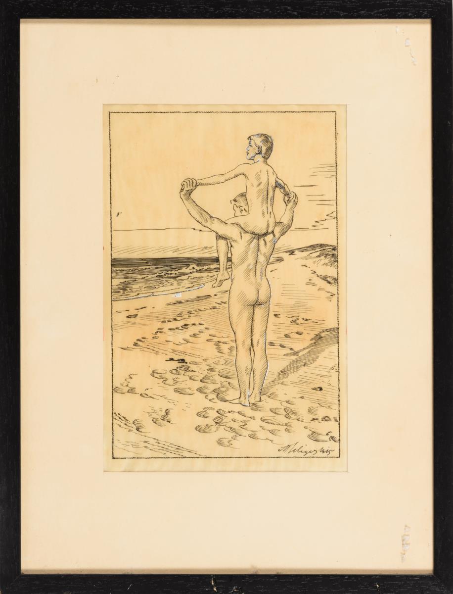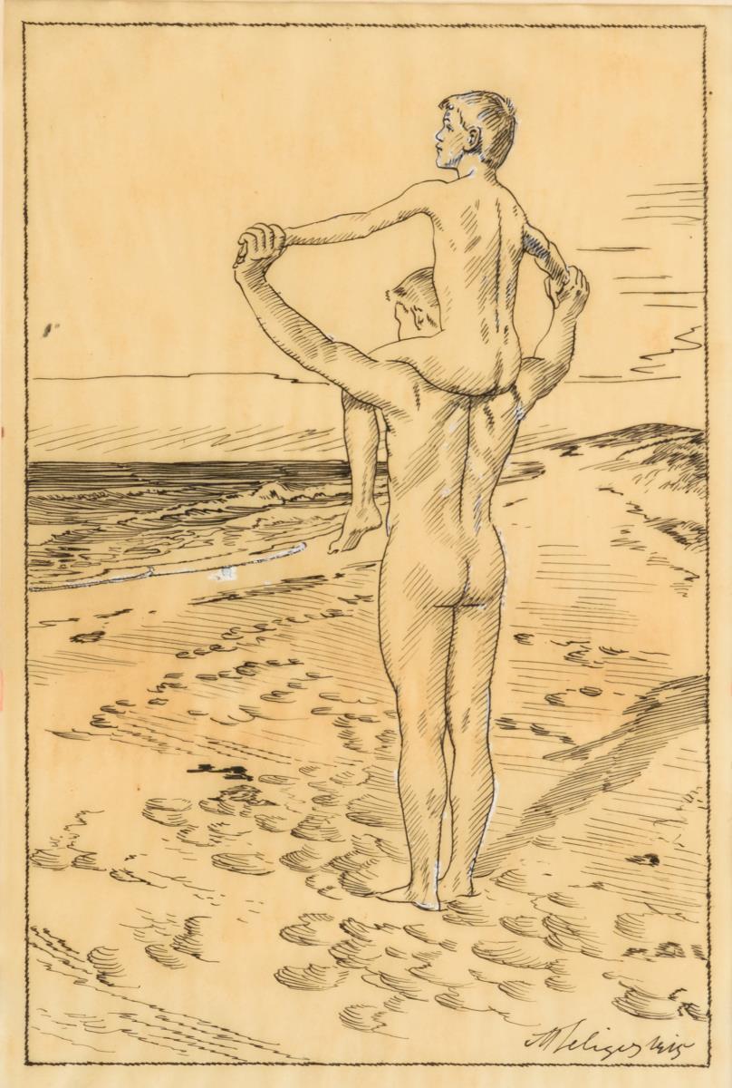 Seliger, Max: Jungen am Meer. Federzeichnung auf Transparentpapier,