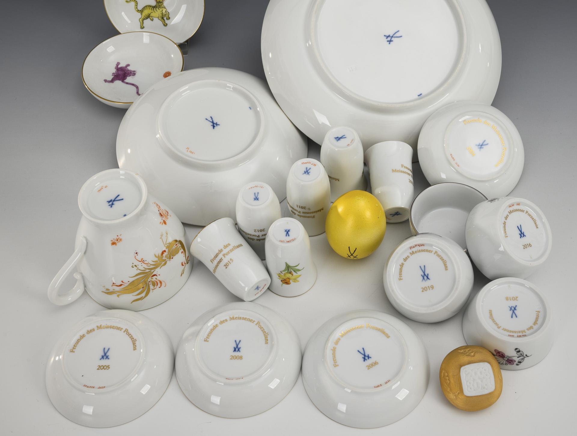 1x place setting "Prachtvogel", shape "Kollektivservice": cup (H 8 cm), saucer (Ø 14.5 cm) and breakfast plate (Ø 19 cm). / 6 + 6 + 4 year porcelains: 6 nut bowls (Ø 8 cm), 6 schnapps cups with flower painting (H 5 cm), 4 small bowls with wine painting (Ø 6 cm). / 1 paperweight "1708-2008" in the shape of a gilded stone (Ø 4.5 cm). / 1 yellow, blown-out and chocolate-filled egg with sword mark (H 5.5 cm).