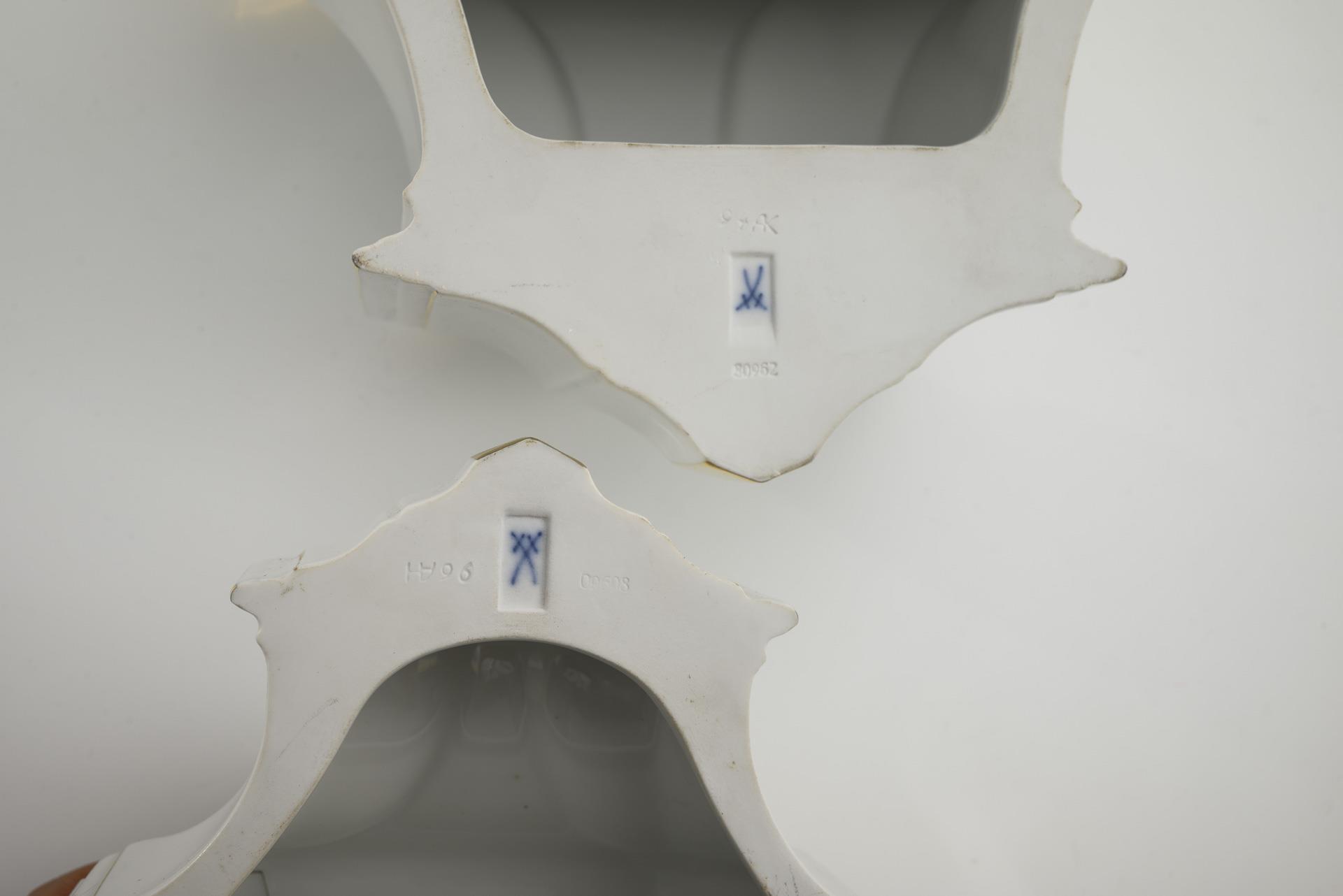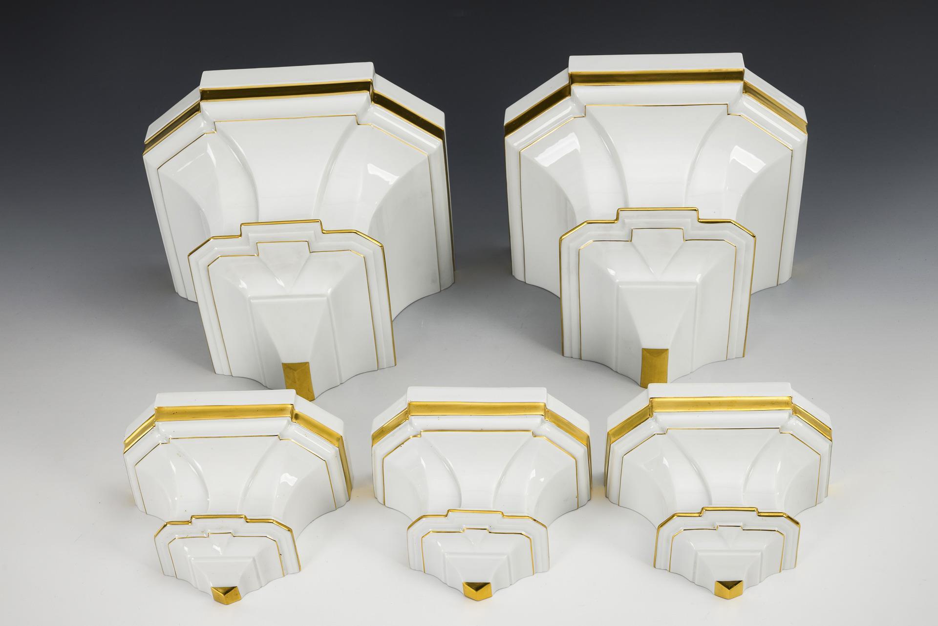 White with gold decoration. H 2x 17.5 cm and 3x 11.5 cm. 7 kg.