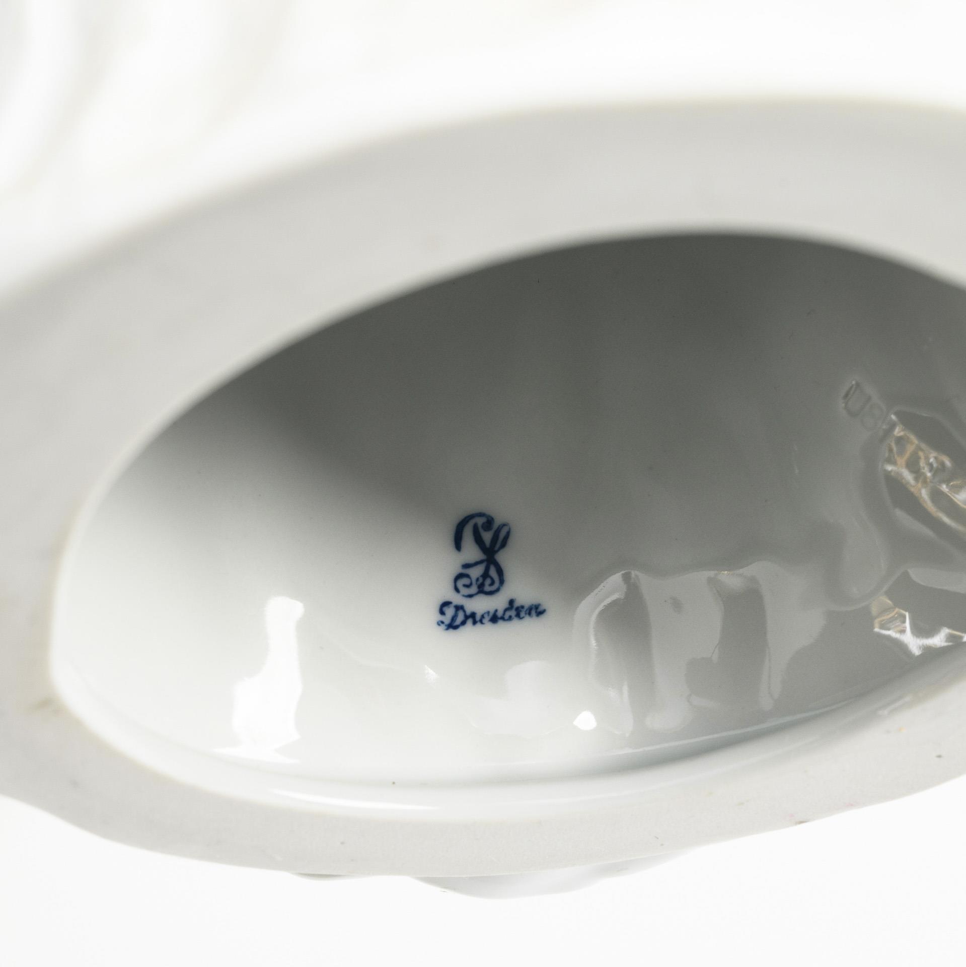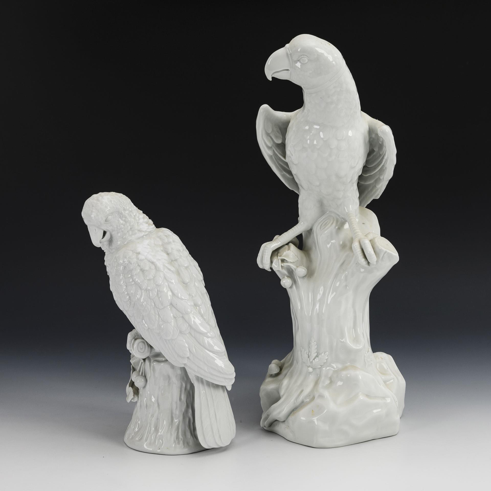 2 different sculptures of a parrot sitting on a tree trunk with cherries.