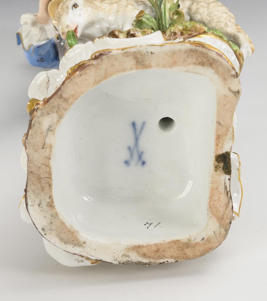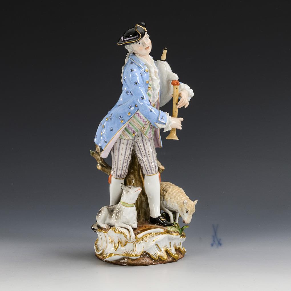 A shepherd playing a bagpipe standing on a natural and rocaille base, a sheep and a dog at his feet. Left sheep's ear bumped, leaves missing, hairline crack in the sheep's right hind leg.