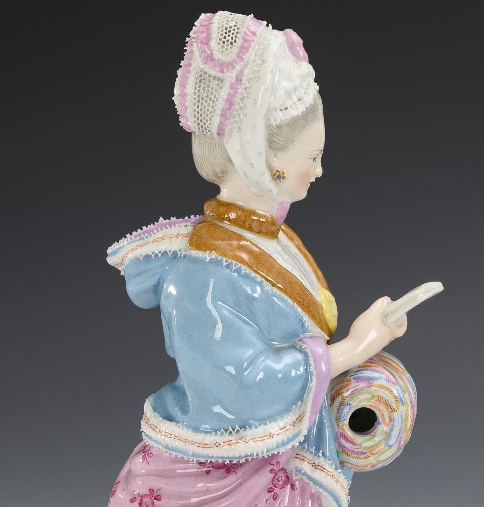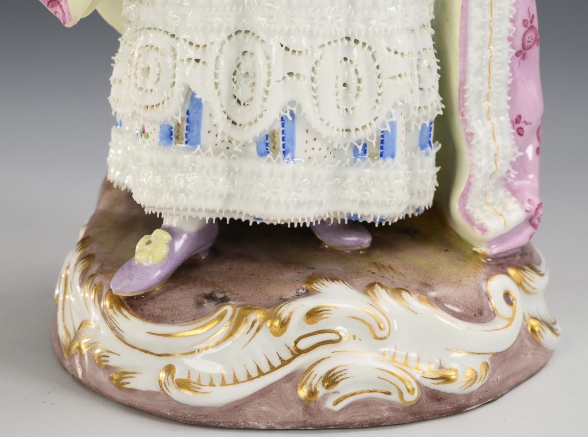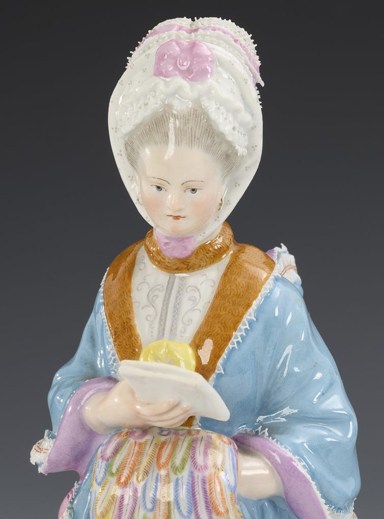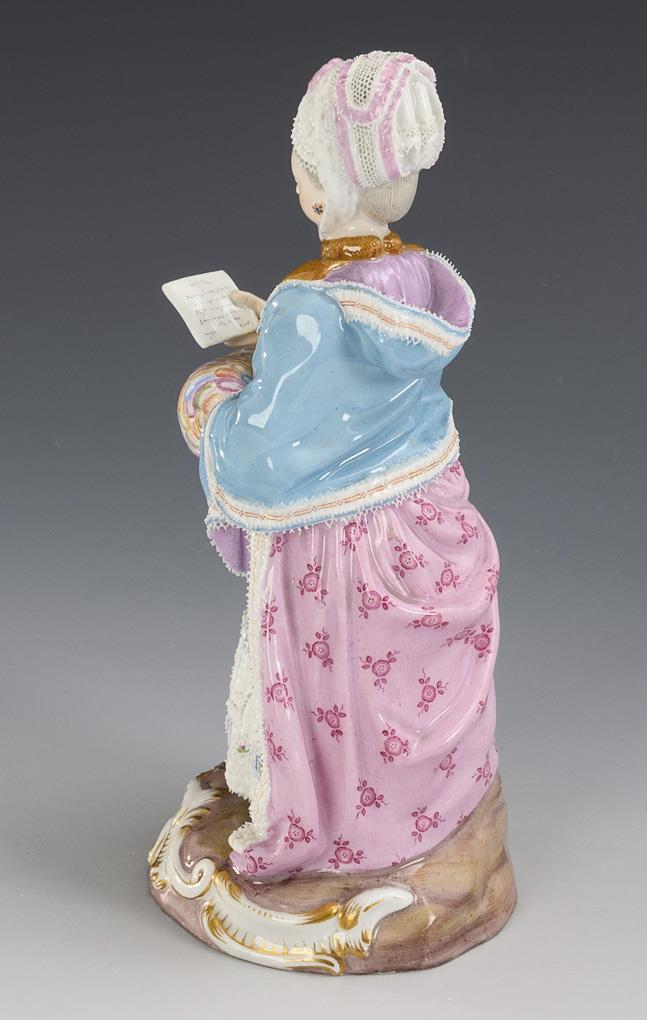 Lady in winter dress standing on a rocaille and terrain base, reading a letter. Tip minimally bumped.