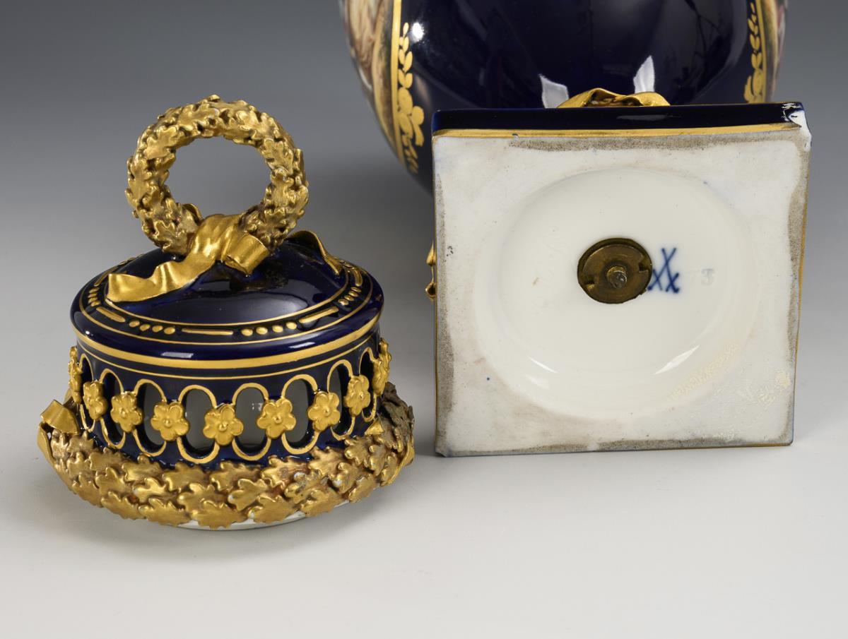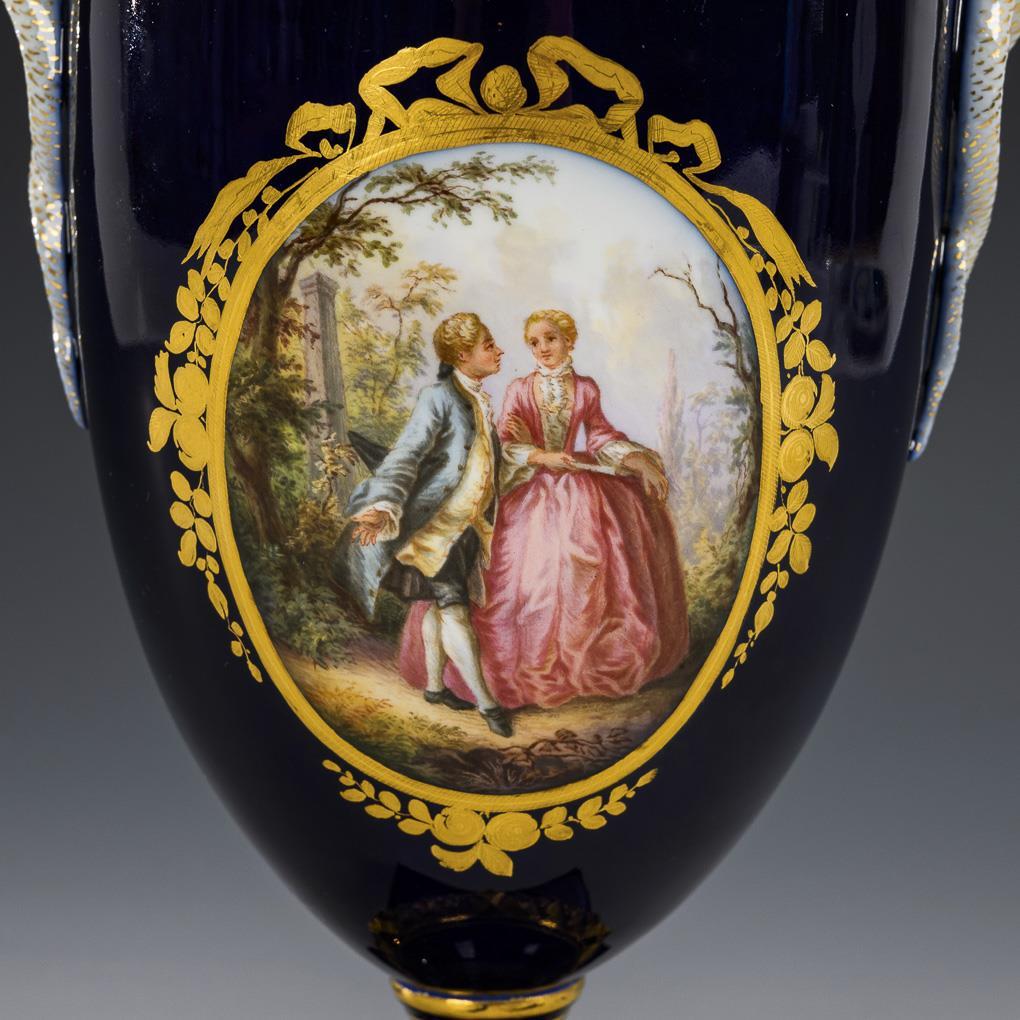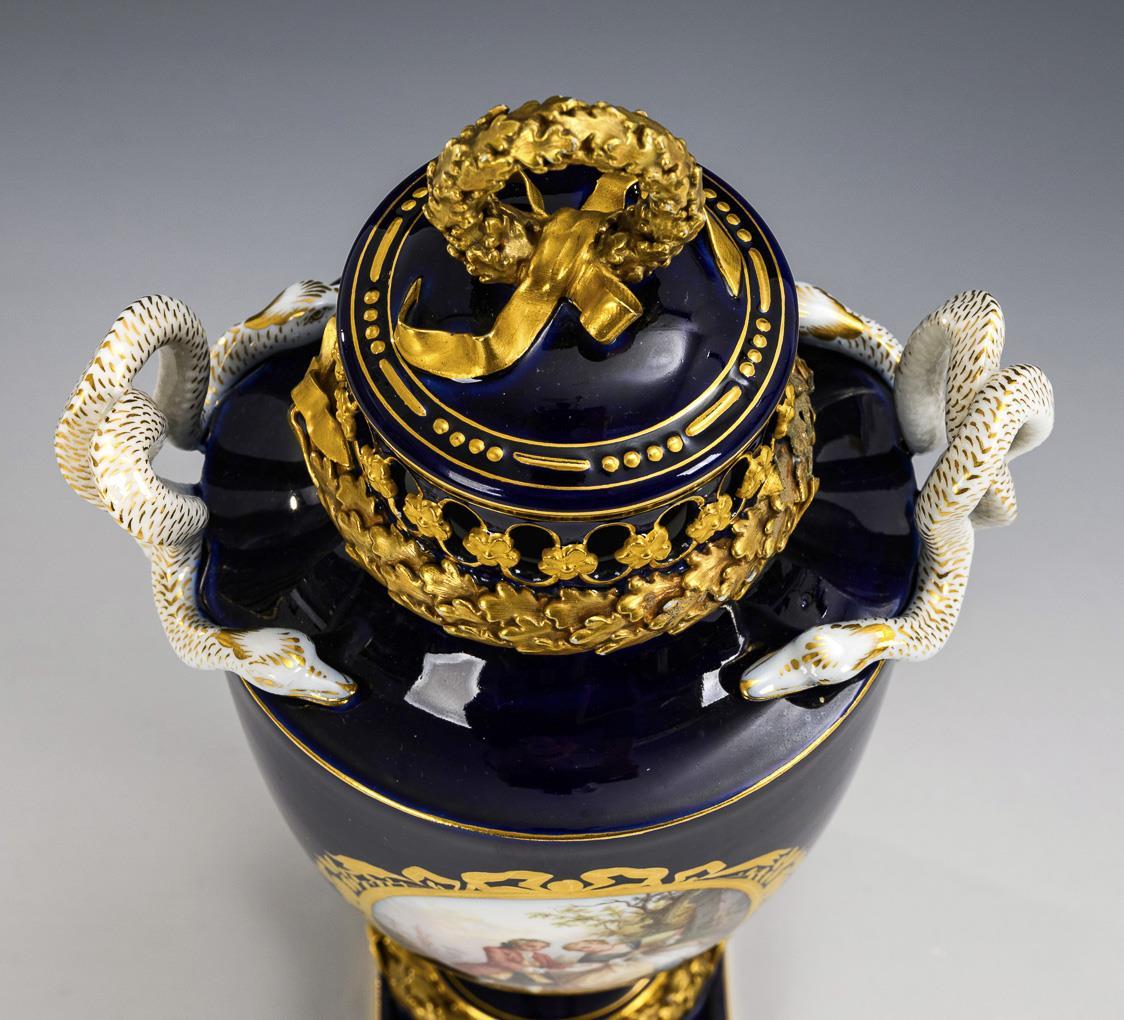 Ovoid body with two snake handles, pierced lid with oak leaf handle and round foot; with inverted oak leaf wreath and square plinth. Cobalt ground, on both sides an oval medallion with gallant couples in a park landscape. Bands of the oak leaf wreath on the lid partly bumped, 2 corners of the base bumped.