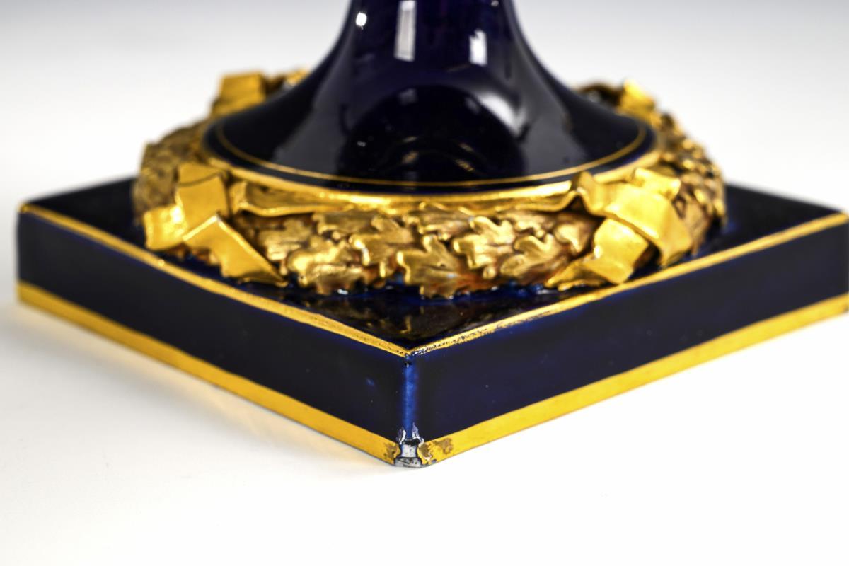 Cobalt blue ground, polychrome painting, gold staffage. H 28 cm.