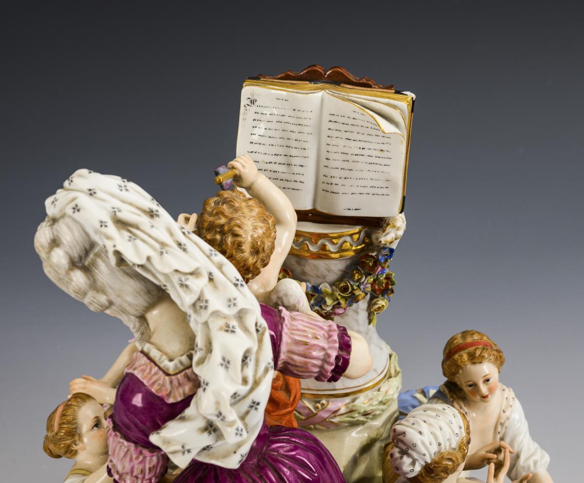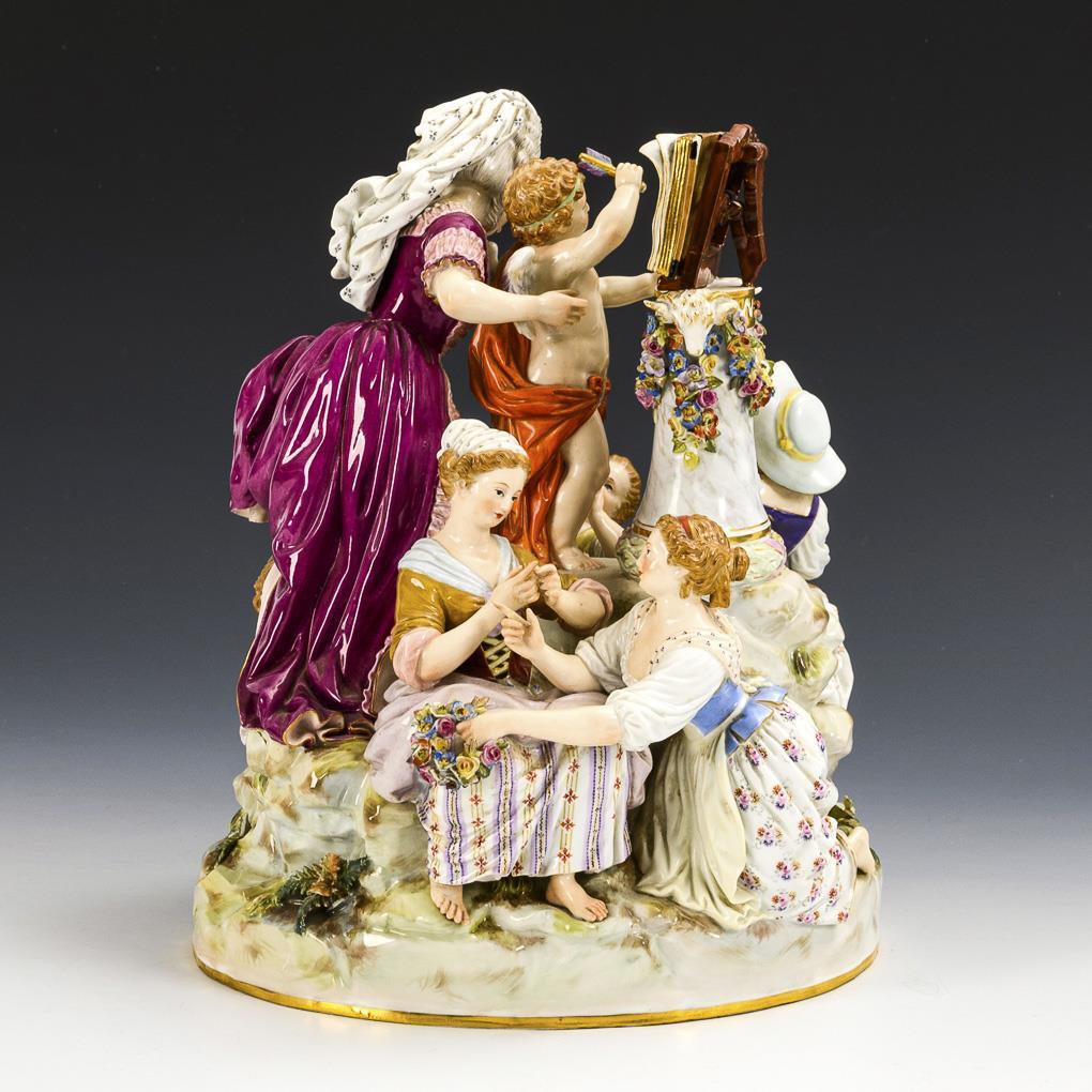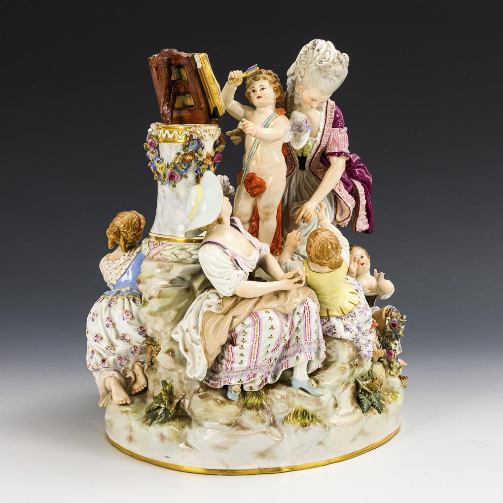 Boy Cupid standing on a rock in front of an open book, instructing a group of ladies and girls in the arts of love. Book stand with book and 1 finger glued, bumps to flowers and leaves, Cupid's arrow, 1 girl's hand, 1 hatband and 1 finger bumped.