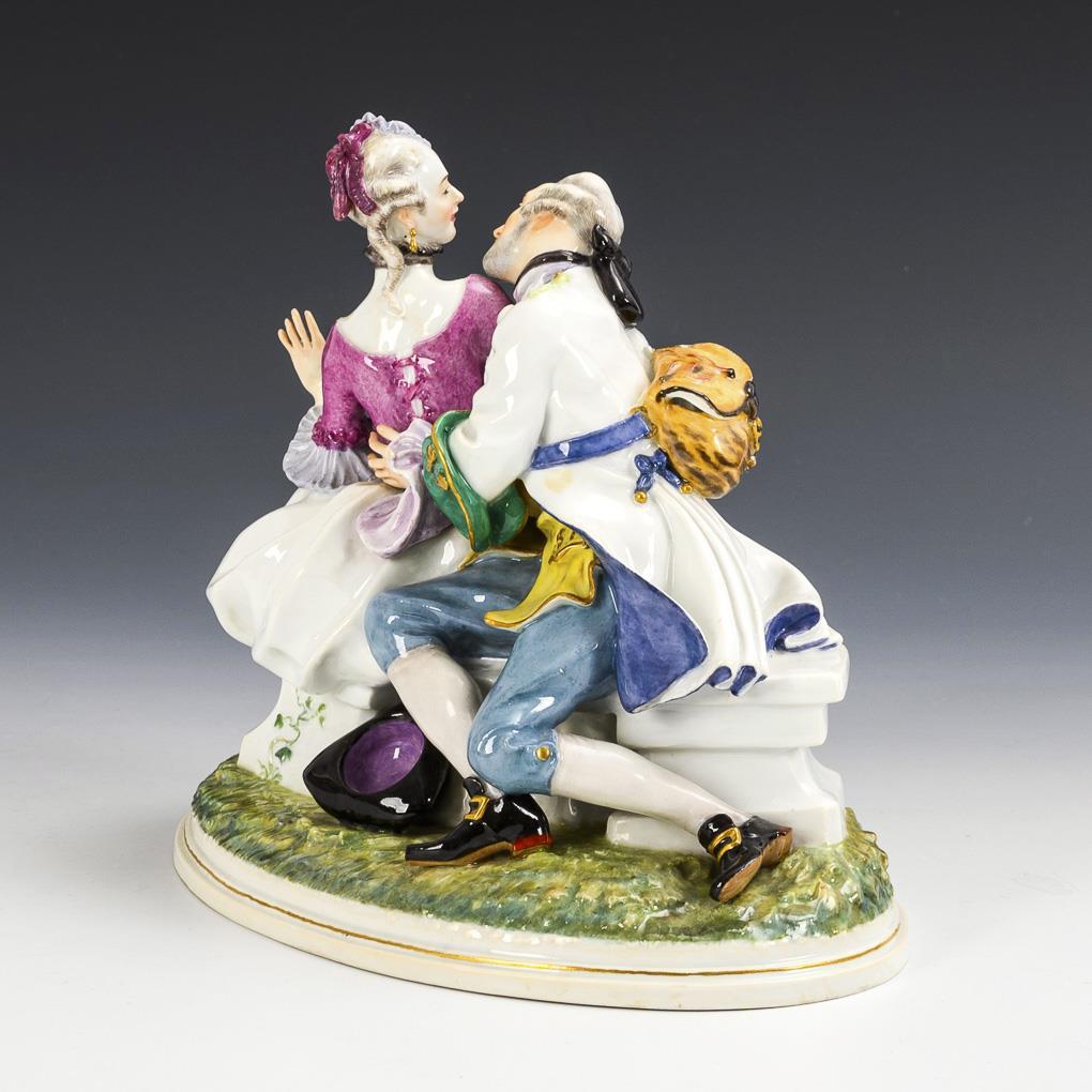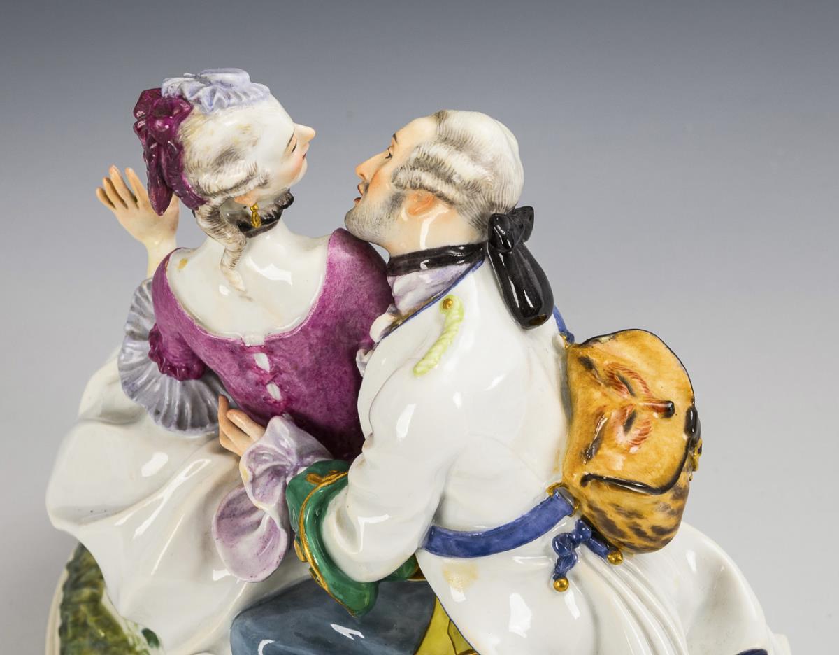 Also "Approach". Gallant group of a hunter approaching a rococo lady. Left hand of the lady and 1 rose petal restored.