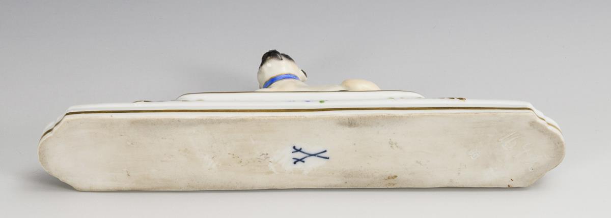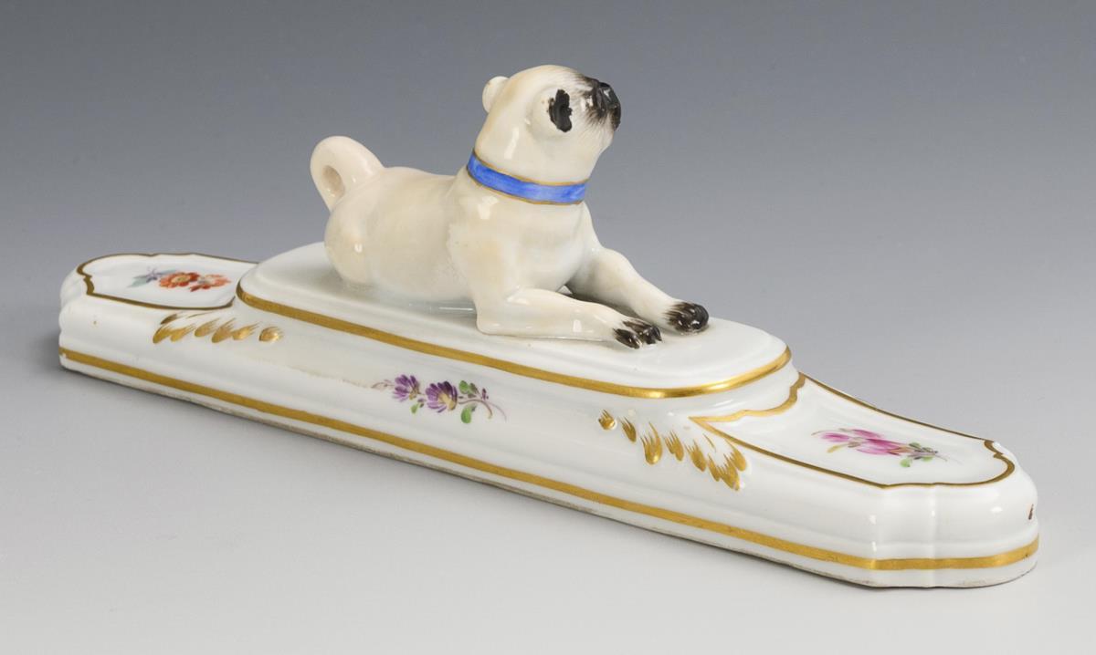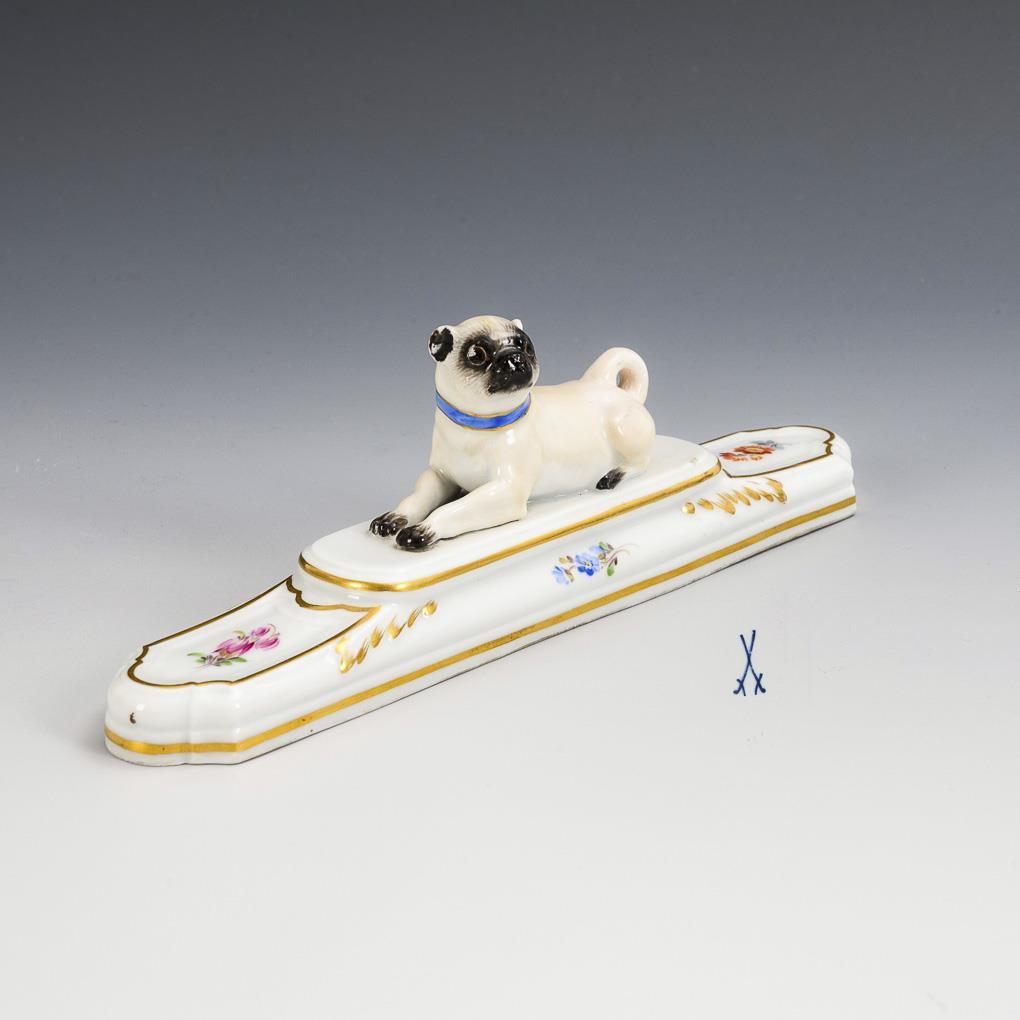 Elongated base with the sculpture of a lying pug. Minimal wear to the right ear.