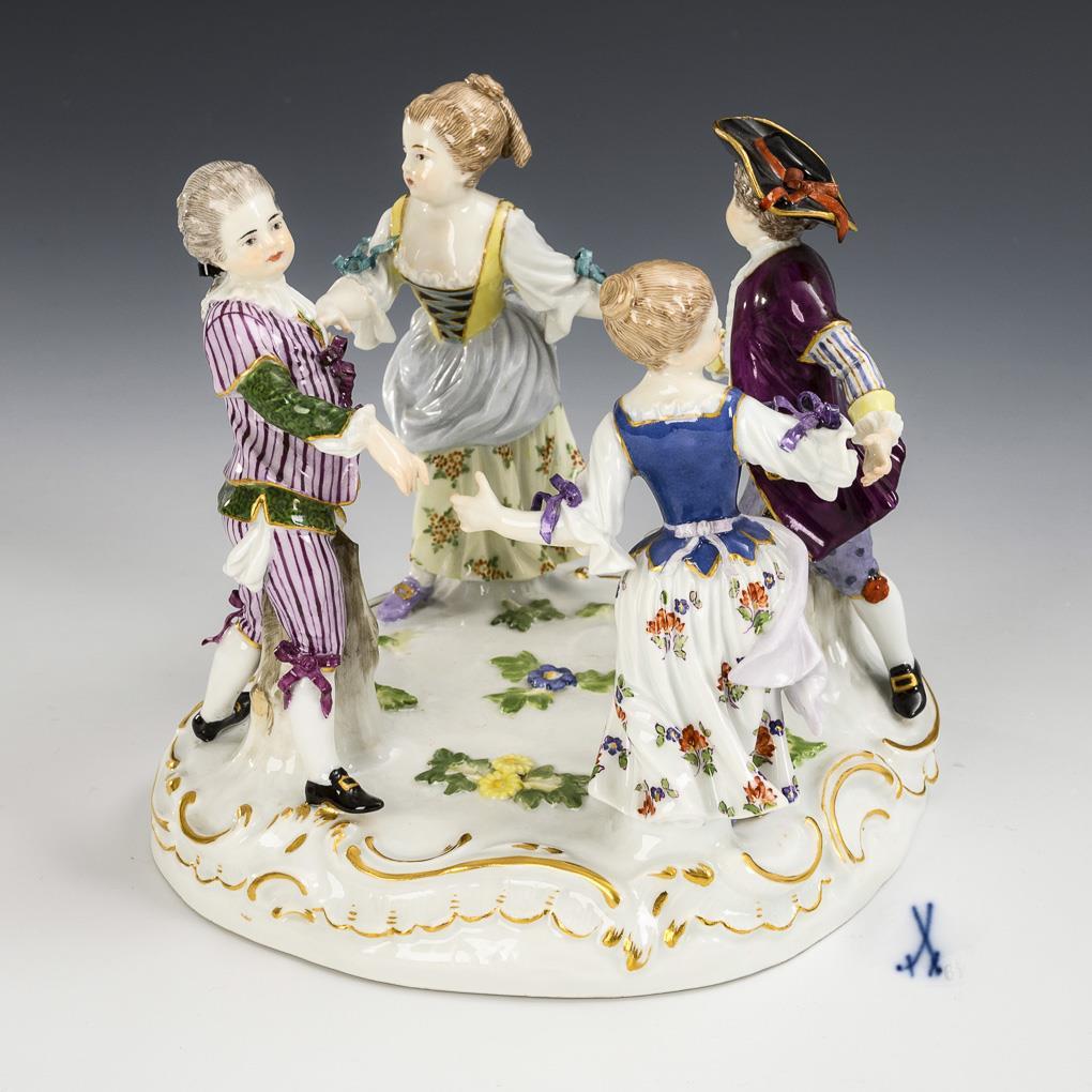 Sculpture of four gardener's children dancing a round dance together. Bow band of 1 hair bow and 1 hat bow bumped.