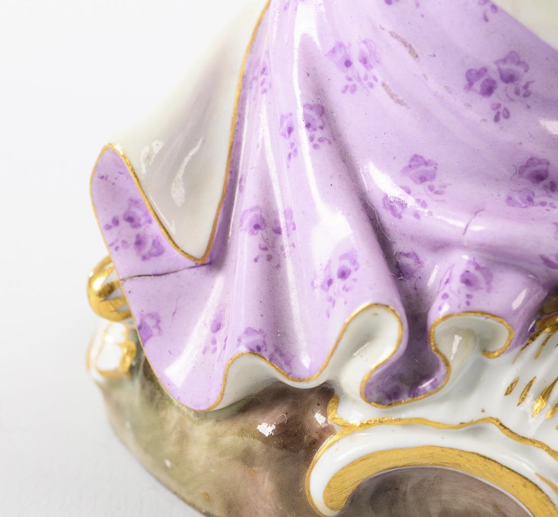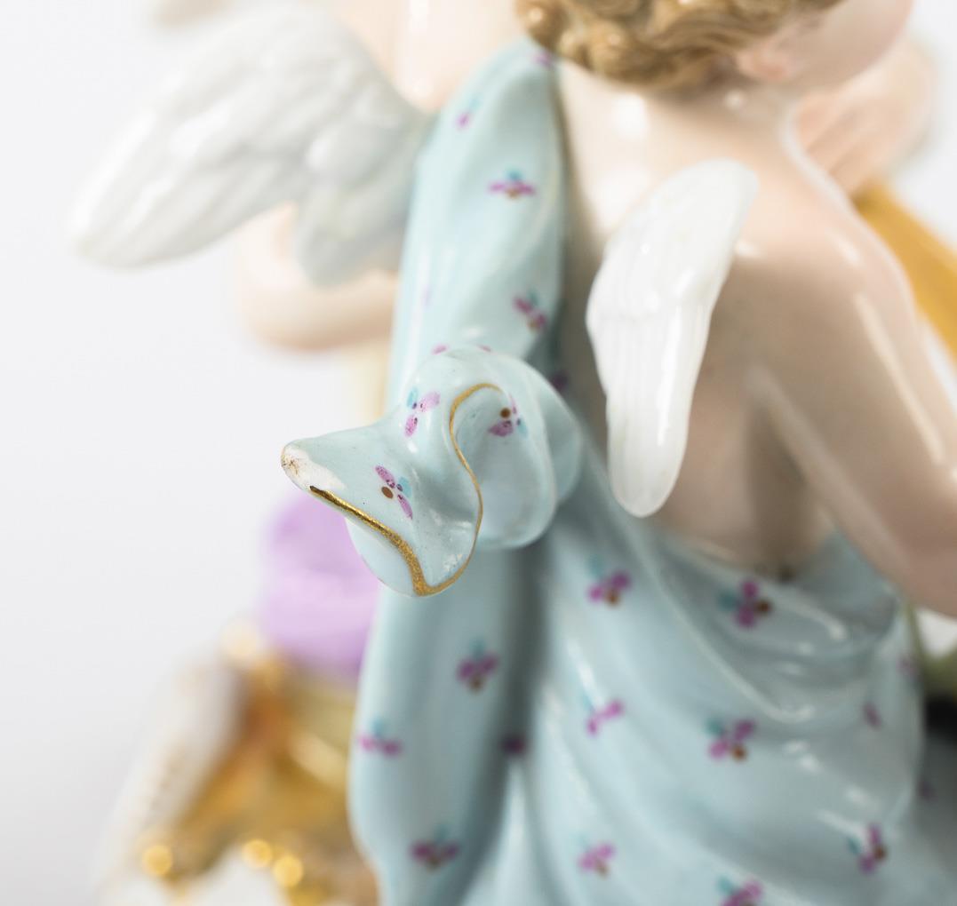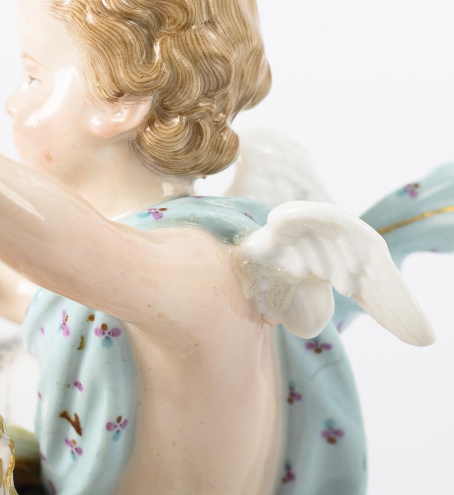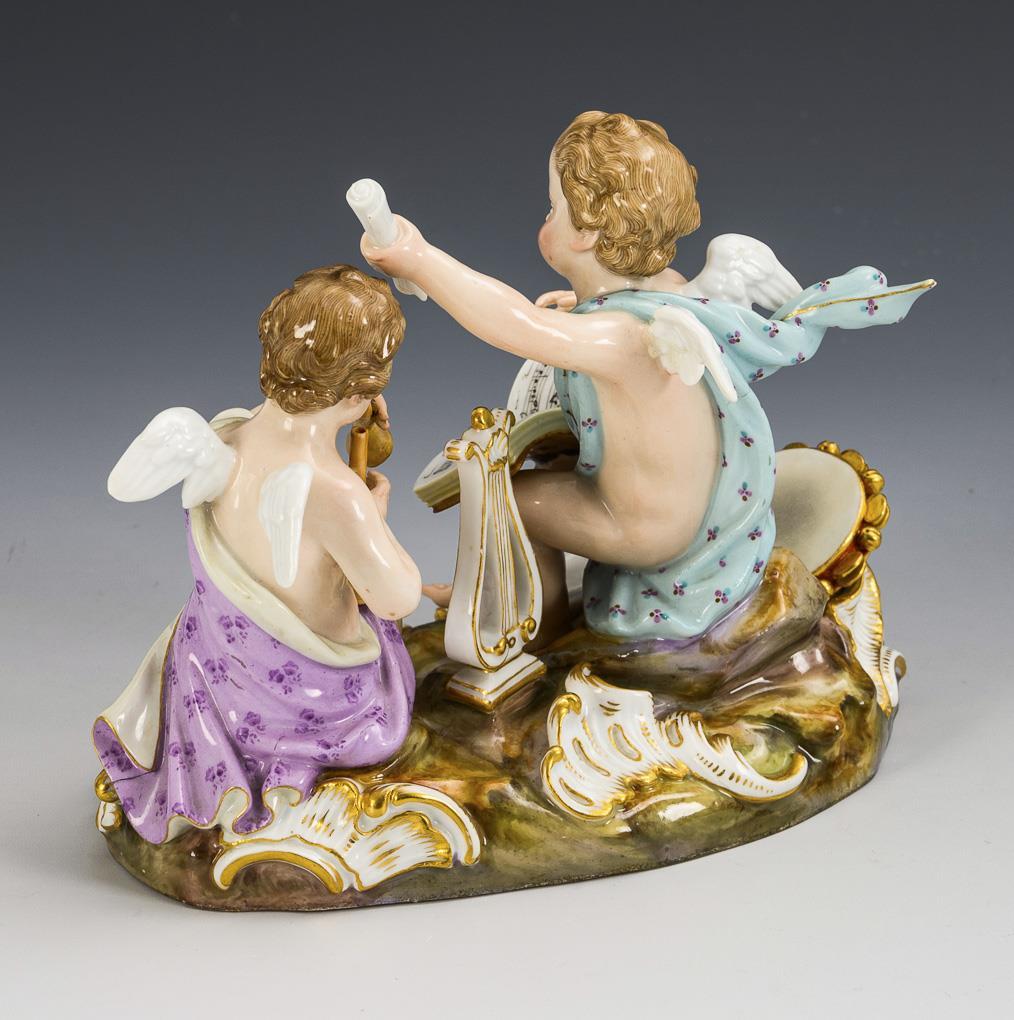 Putti couple playing music with music book and instruments on a natural rocaille base. Minimal wear to the edge of the base, shawm and 1 hand restored; 1 wing glued, small fire crack to 1 edge of the garment.
