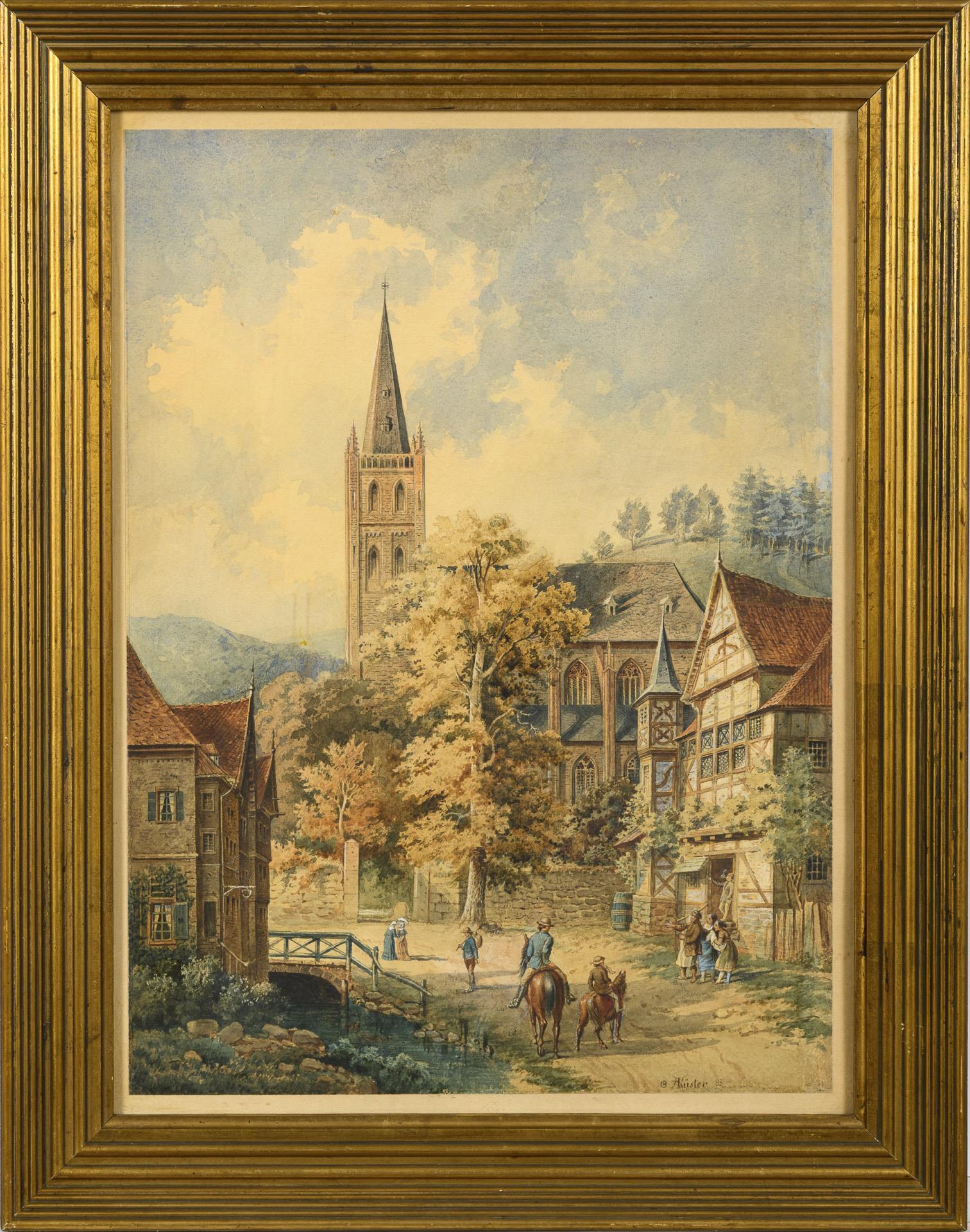 Staffage figures on the street between the detailed painted half-timbered houses in front of the Gothic church.