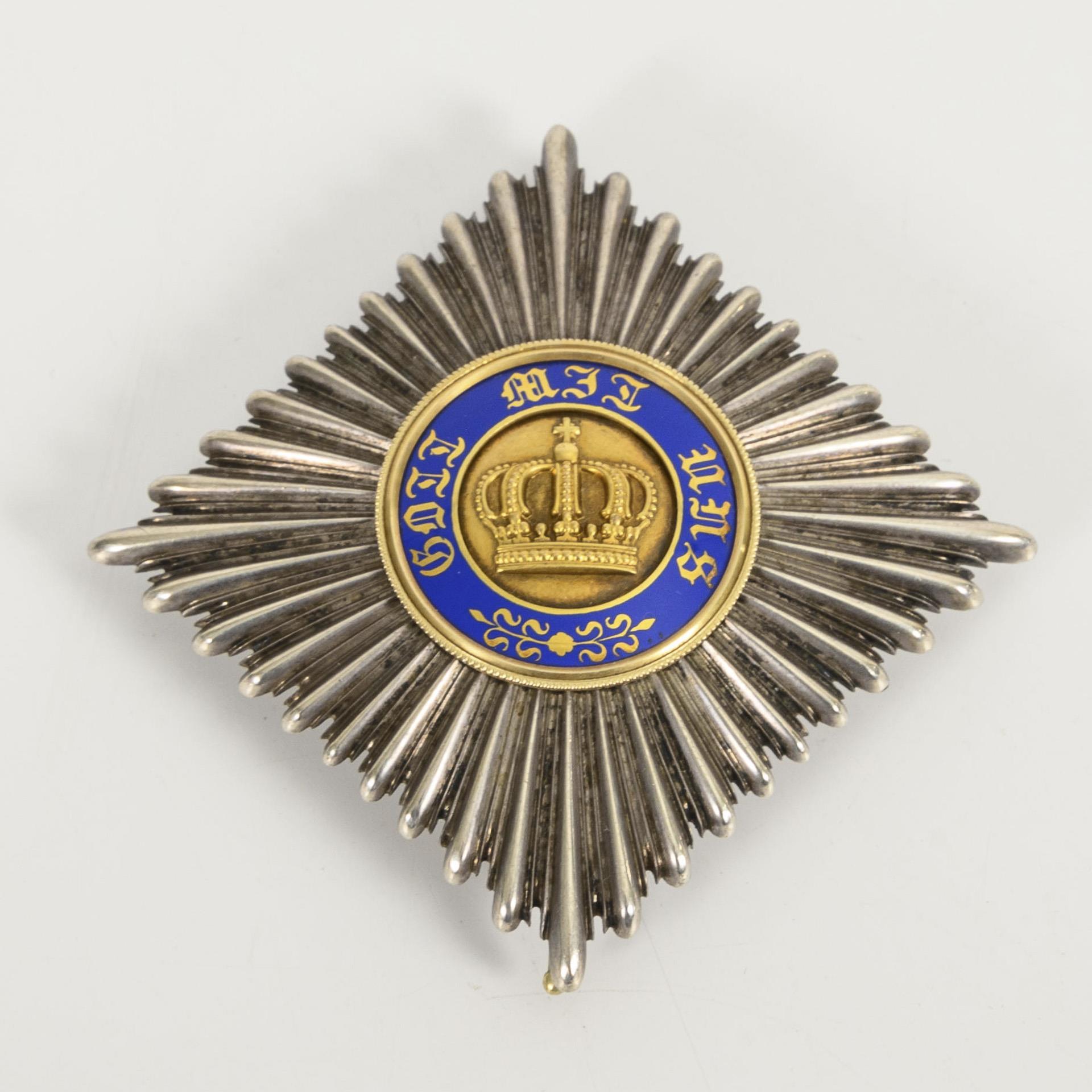 3rd model with large royal crown in medallion, breast star for II. class. Back side with punched 'W' (company Wagner & Sohn, Berlin), punched 'V' on the pin hinge. Needle with small ball at the tip.