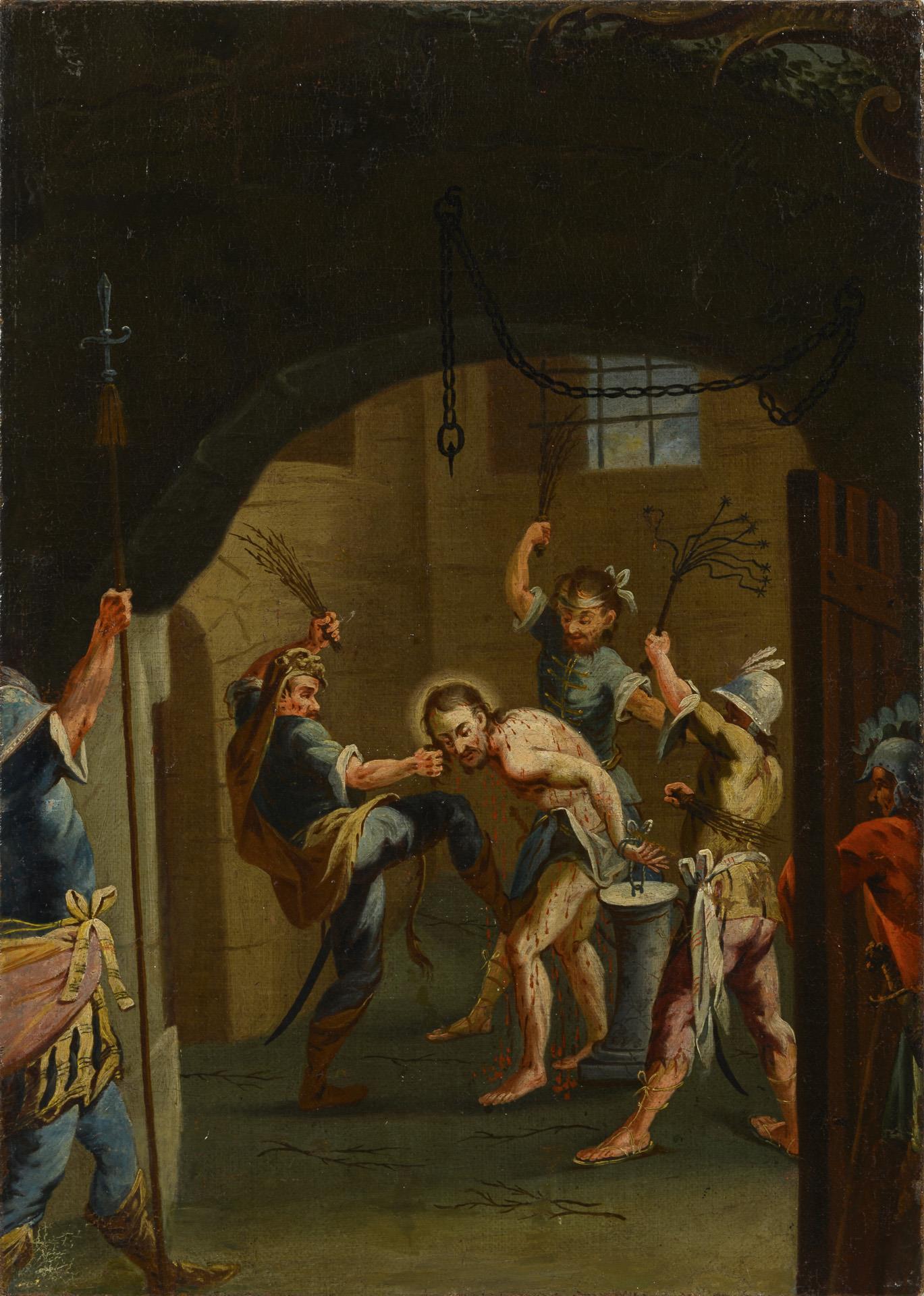 The bleeding Messiah in the dungeon with his tormentors. Traces of age.
