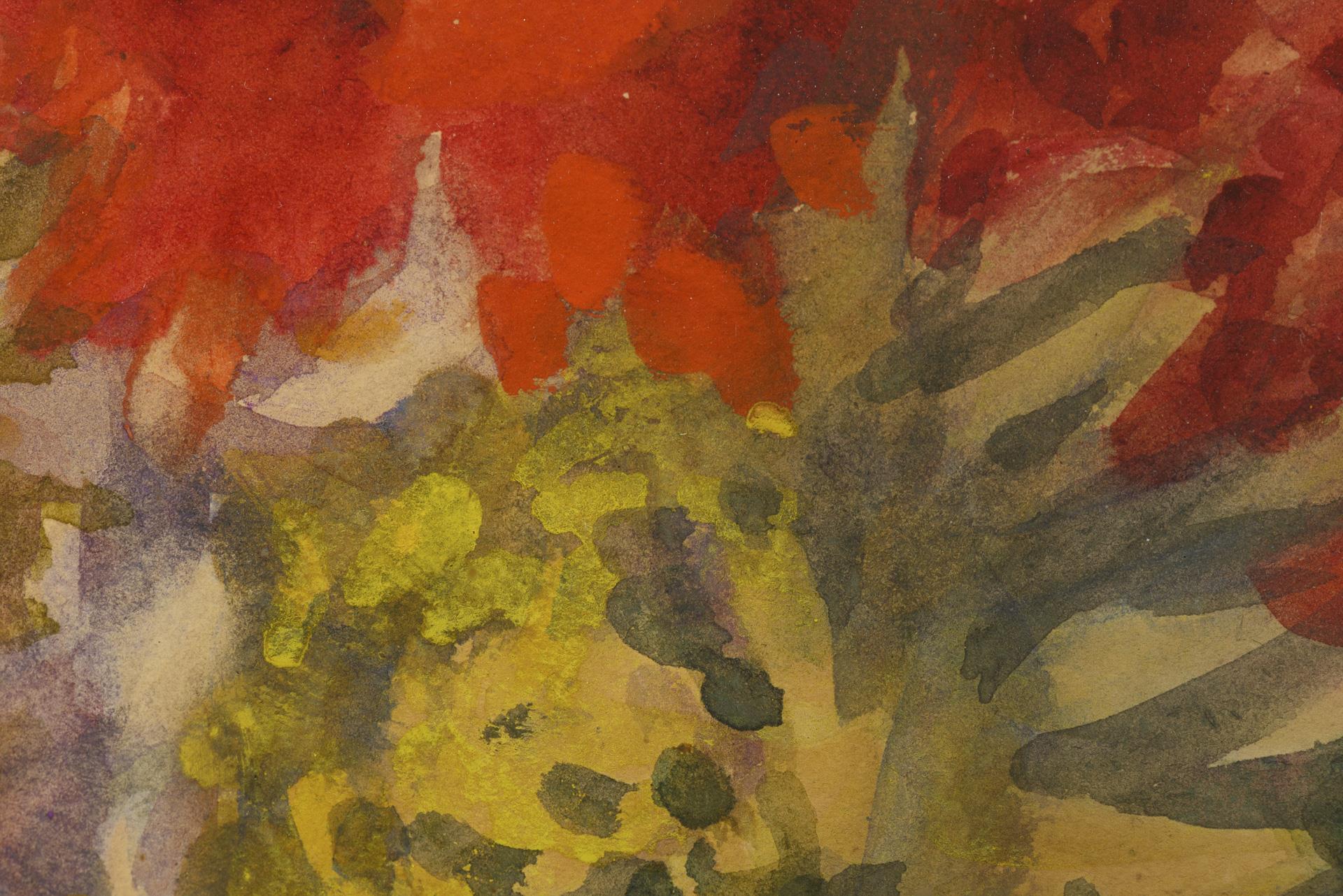 Variously colored flowers with large bright blossoms in dark blue vase. Traces of age.