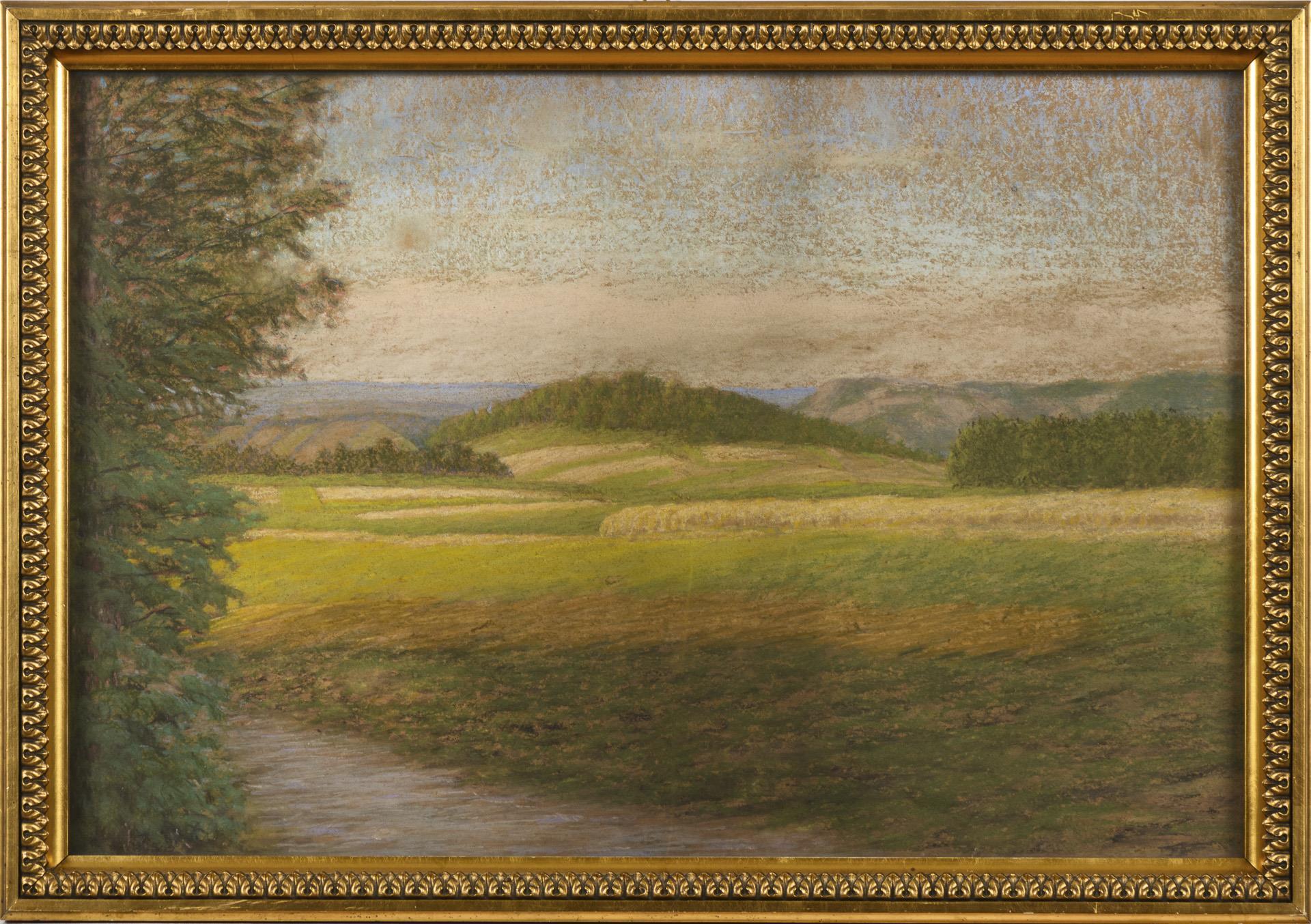 Mountainous late summer landscape with yellow cornfield in the sunshine. Slight traces of age.