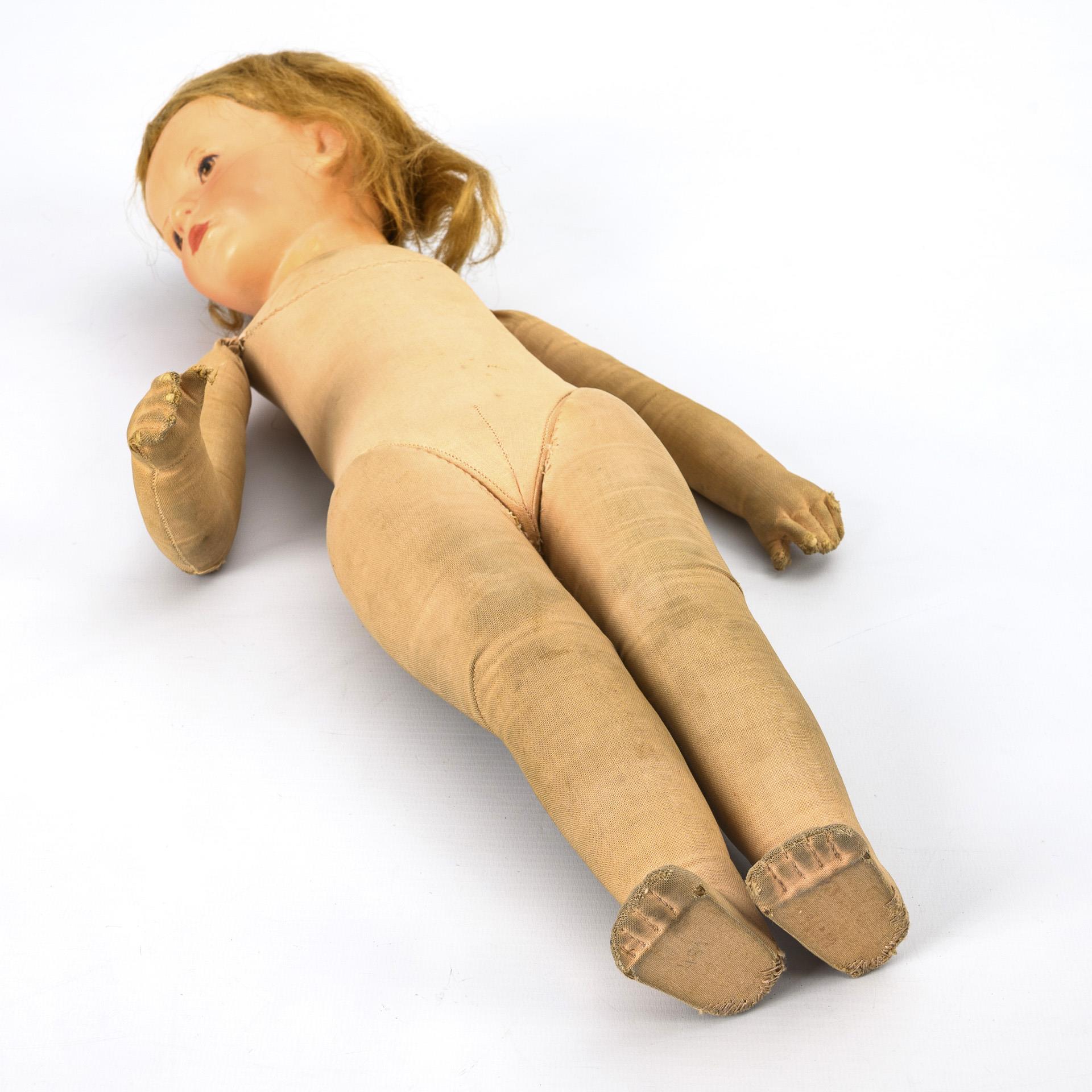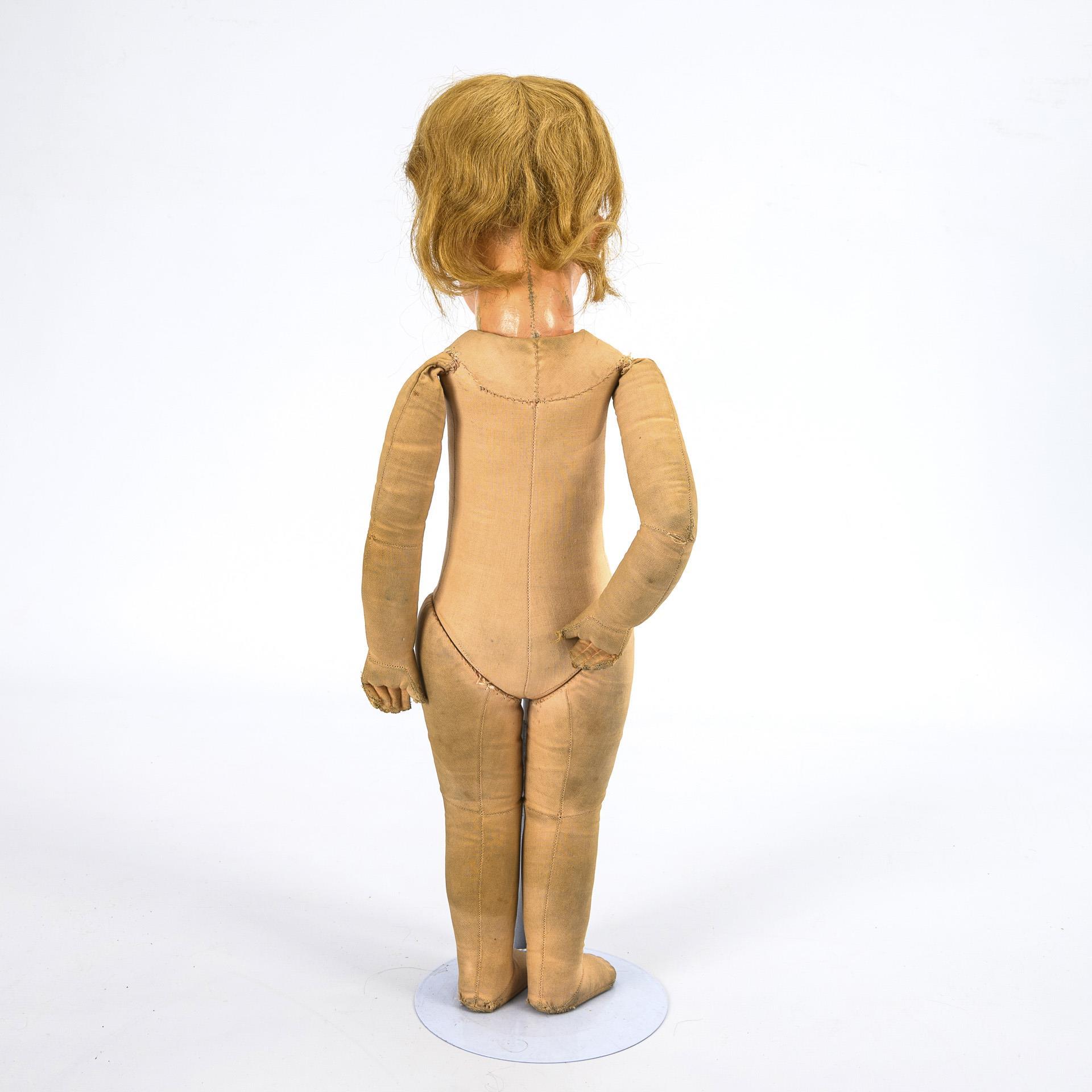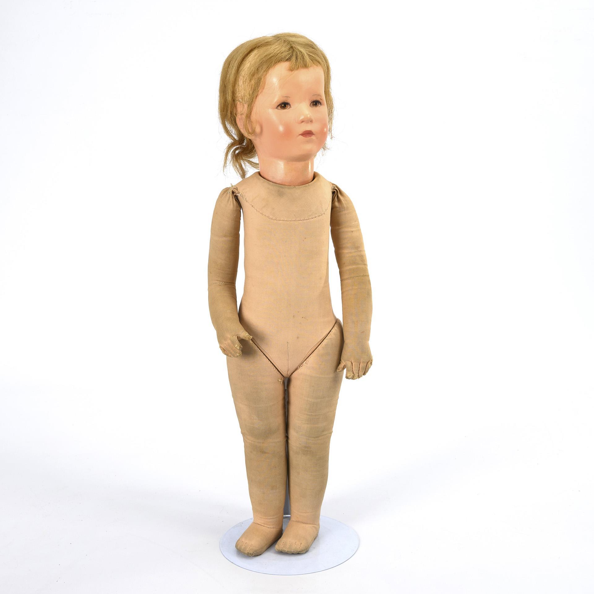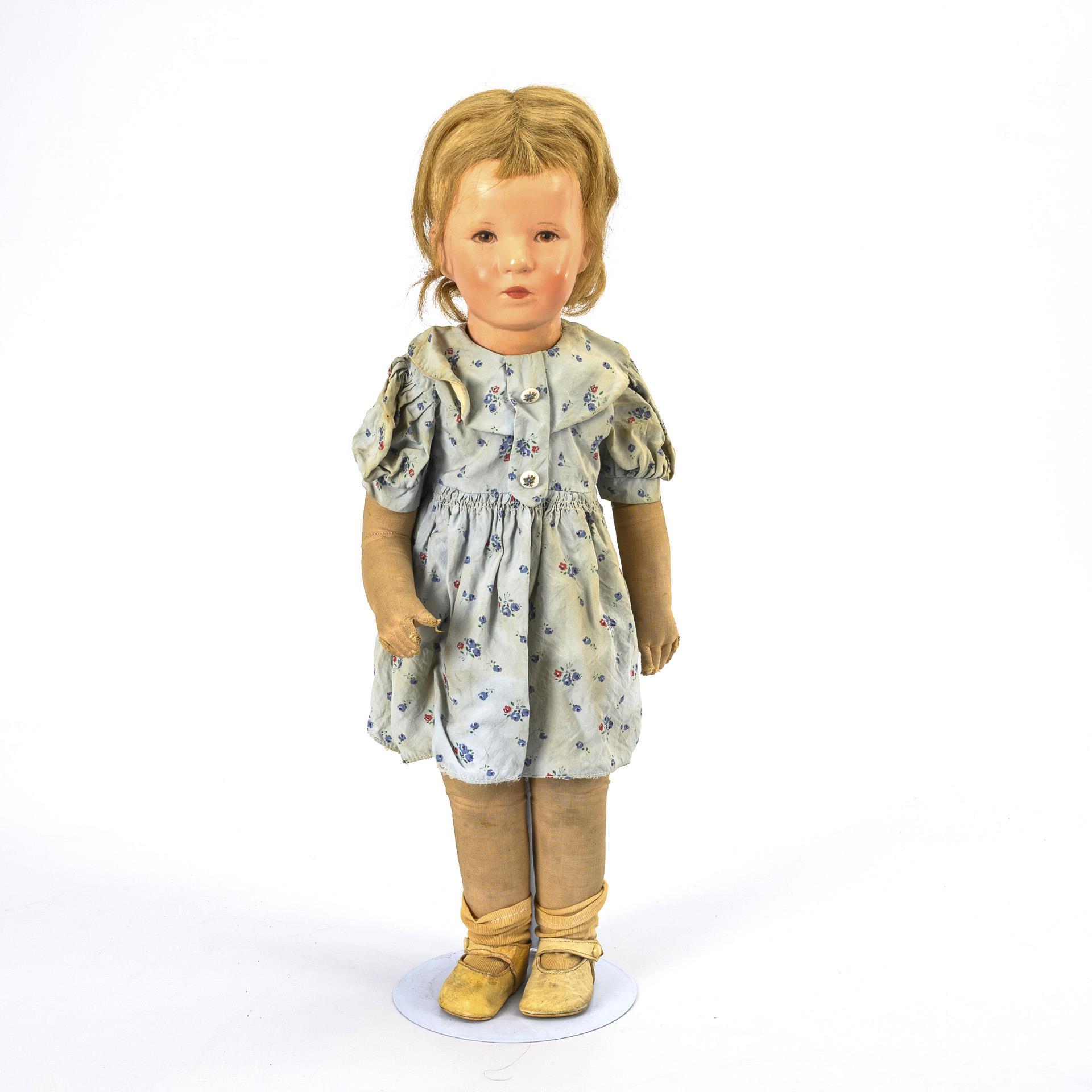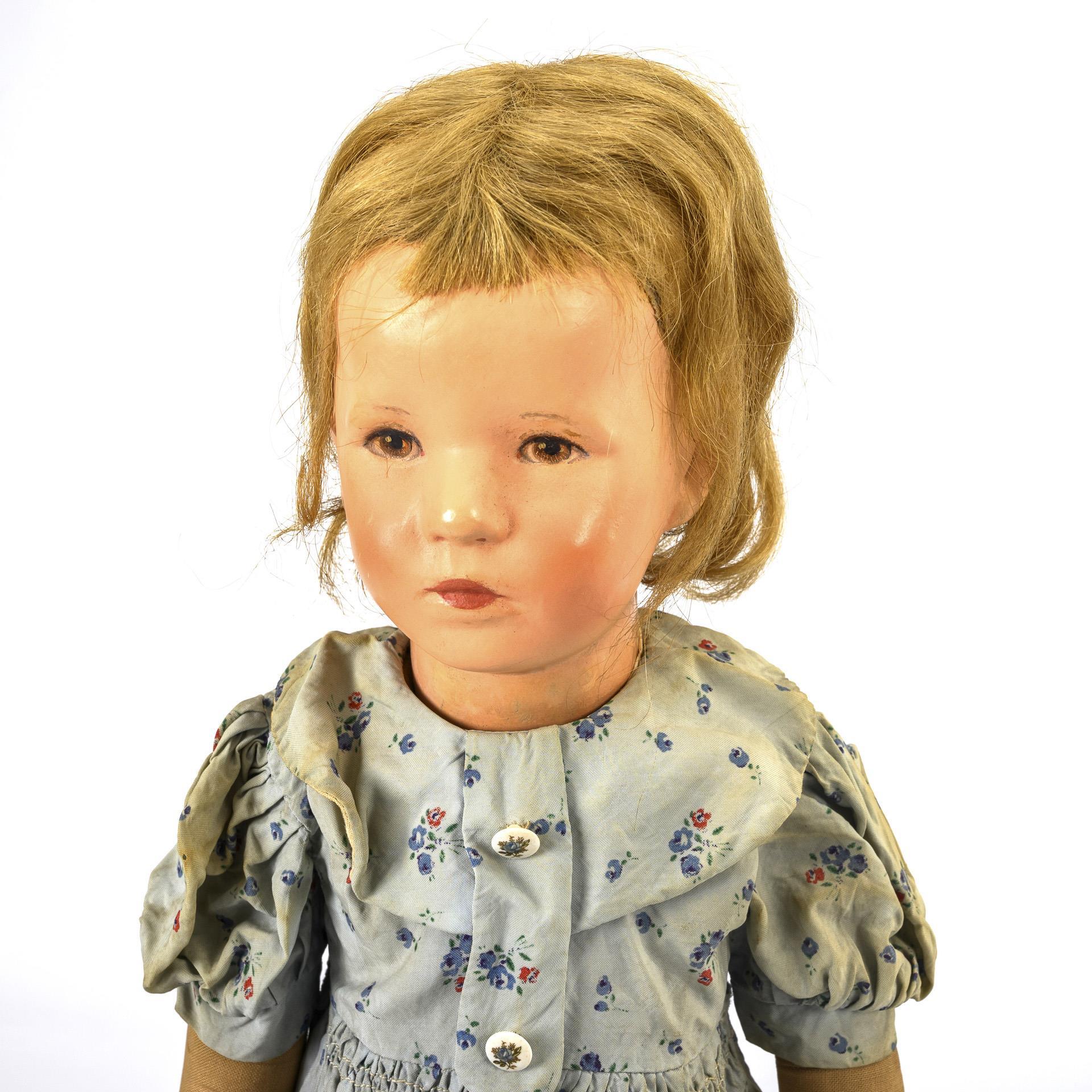 Type VIII. crank head with a seam at the back of the head, painted brown eyes and defective real hair bead. Slender fabric body. Light blue dress with scattered flower pattern, white leather shoes. Small retouches to the head, fingers with defects, feet with traces of repair.