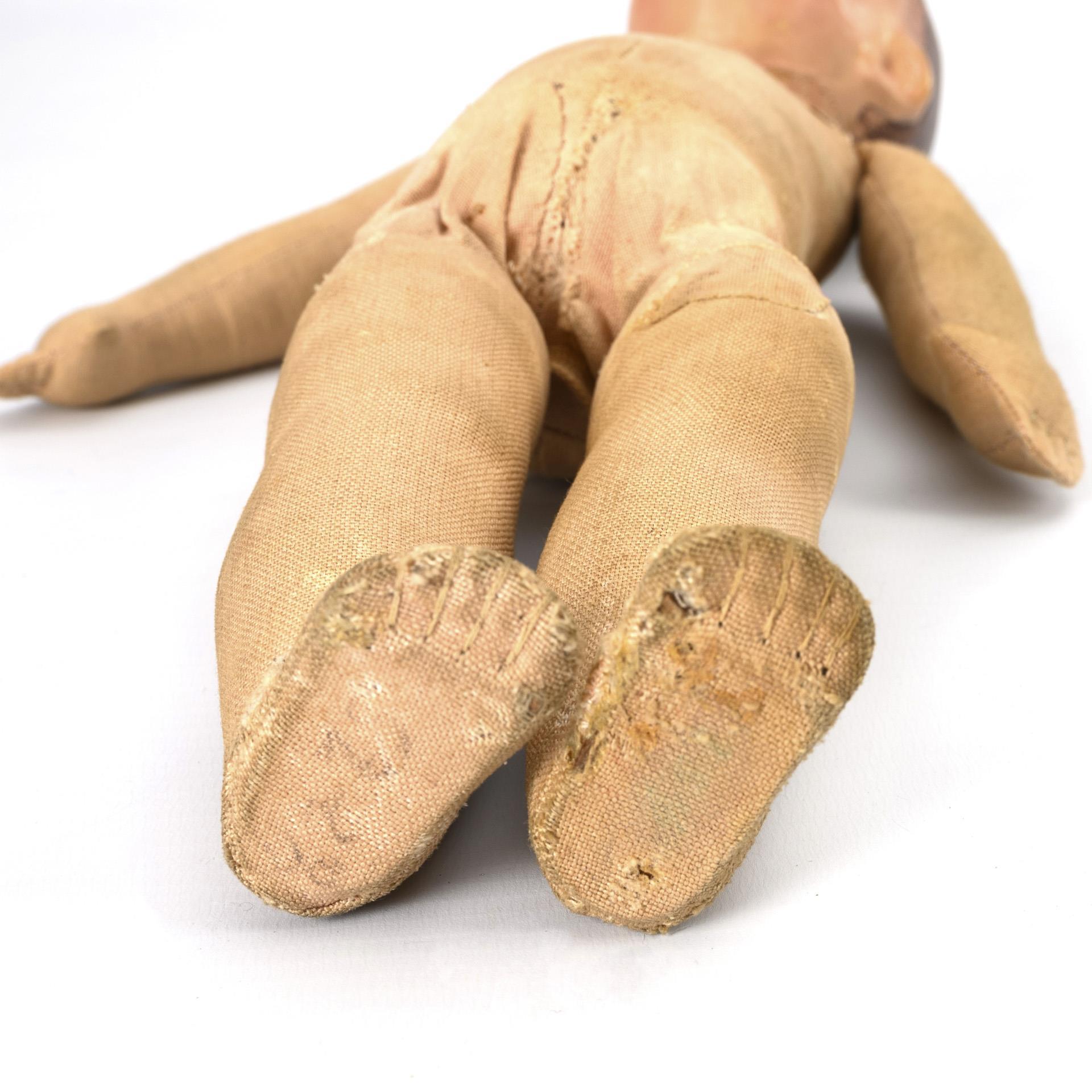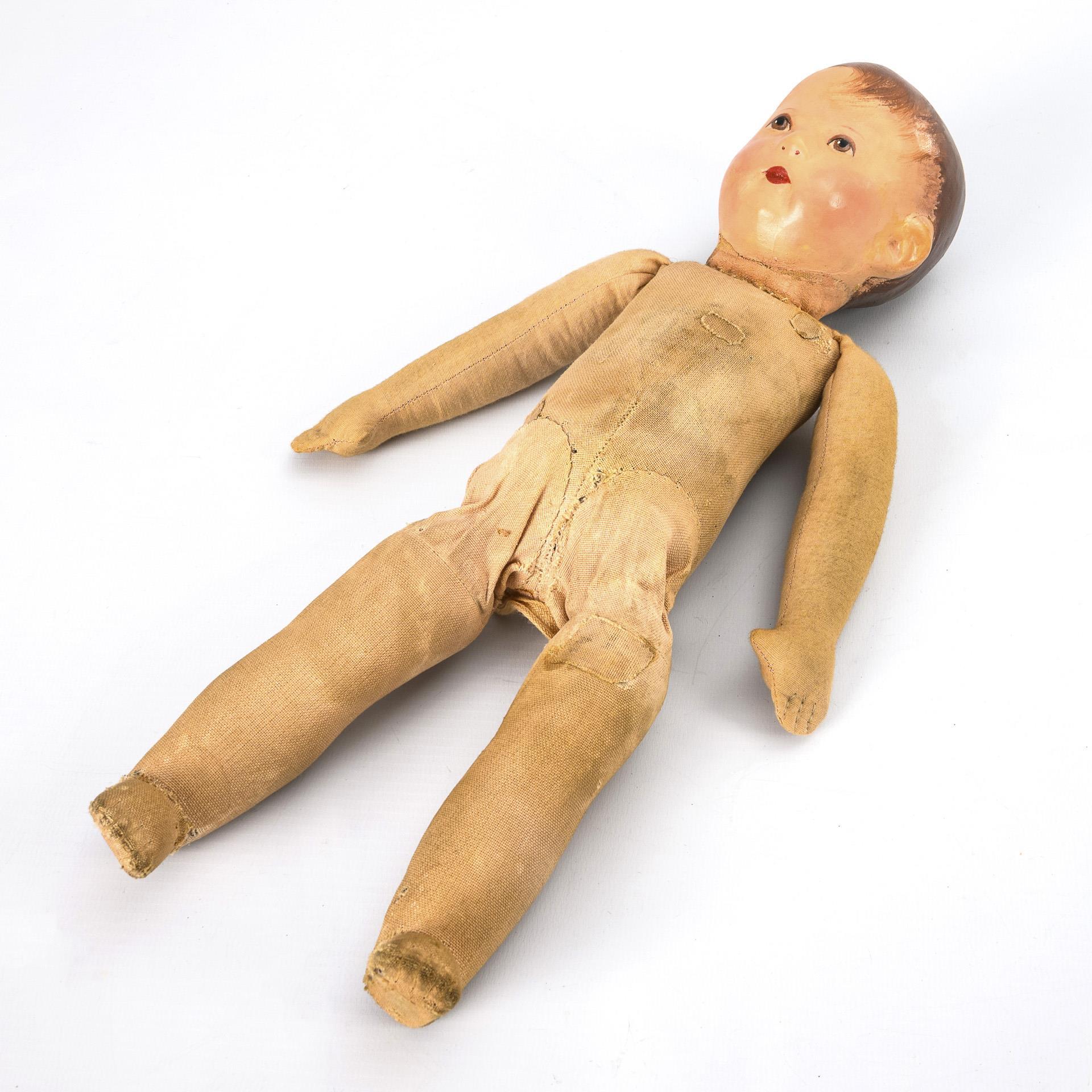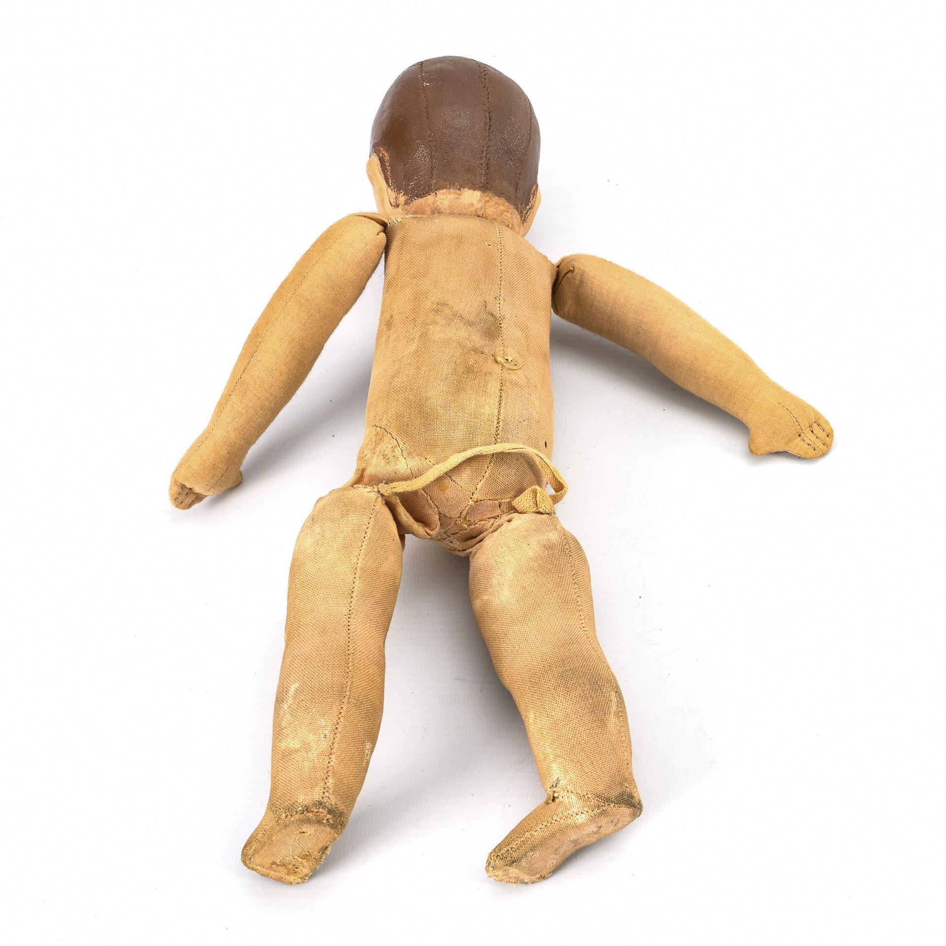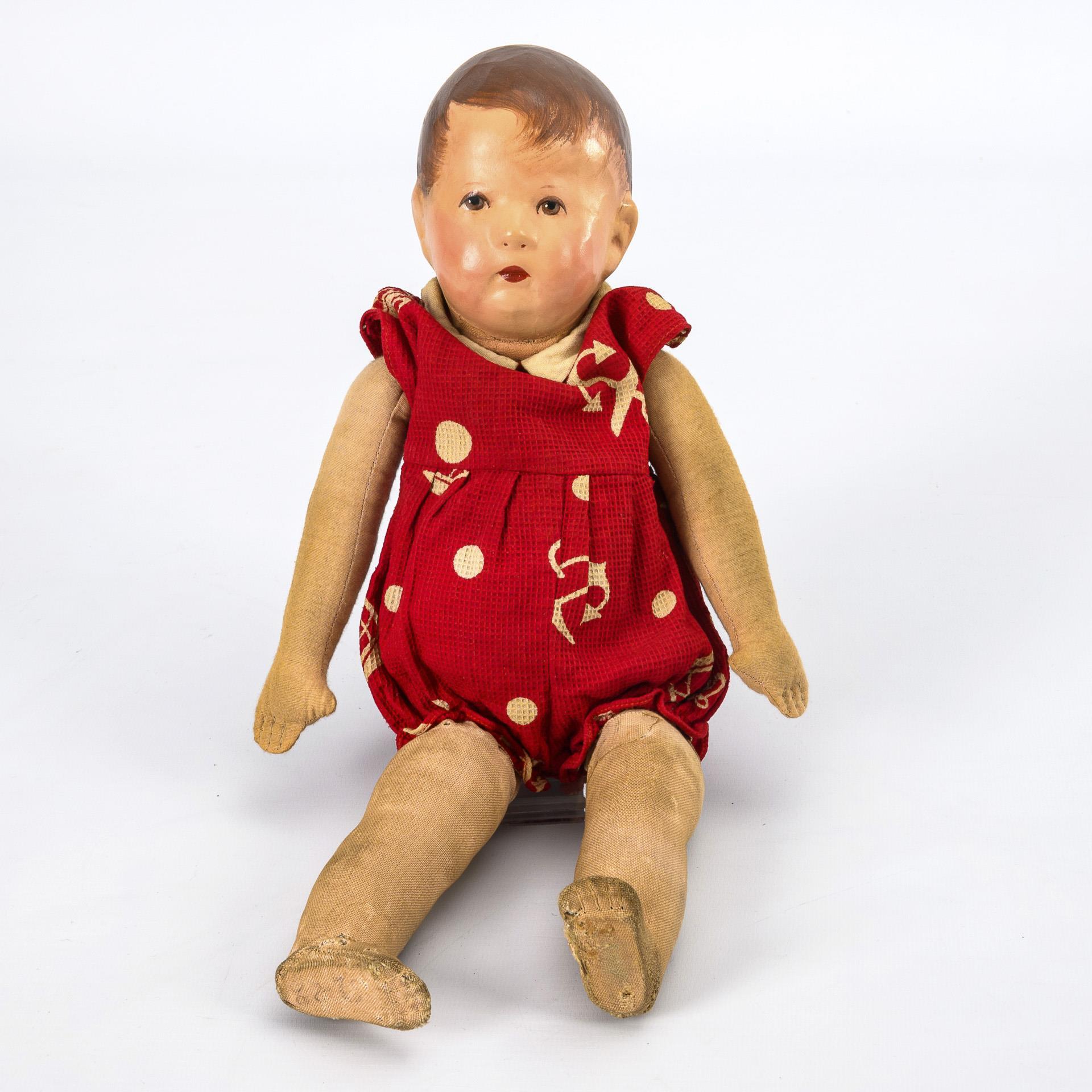 Type XIII, smaller version of the Hampelchen or Notstandskind. Fabric head with 3 occipital nethers and painted hair. Cloth body with loose legs, button and thumbs. In a red playsuit. Restored. Head with retouches, body with small defects and repairs.