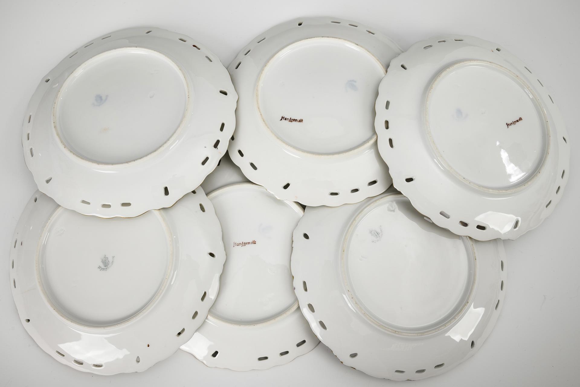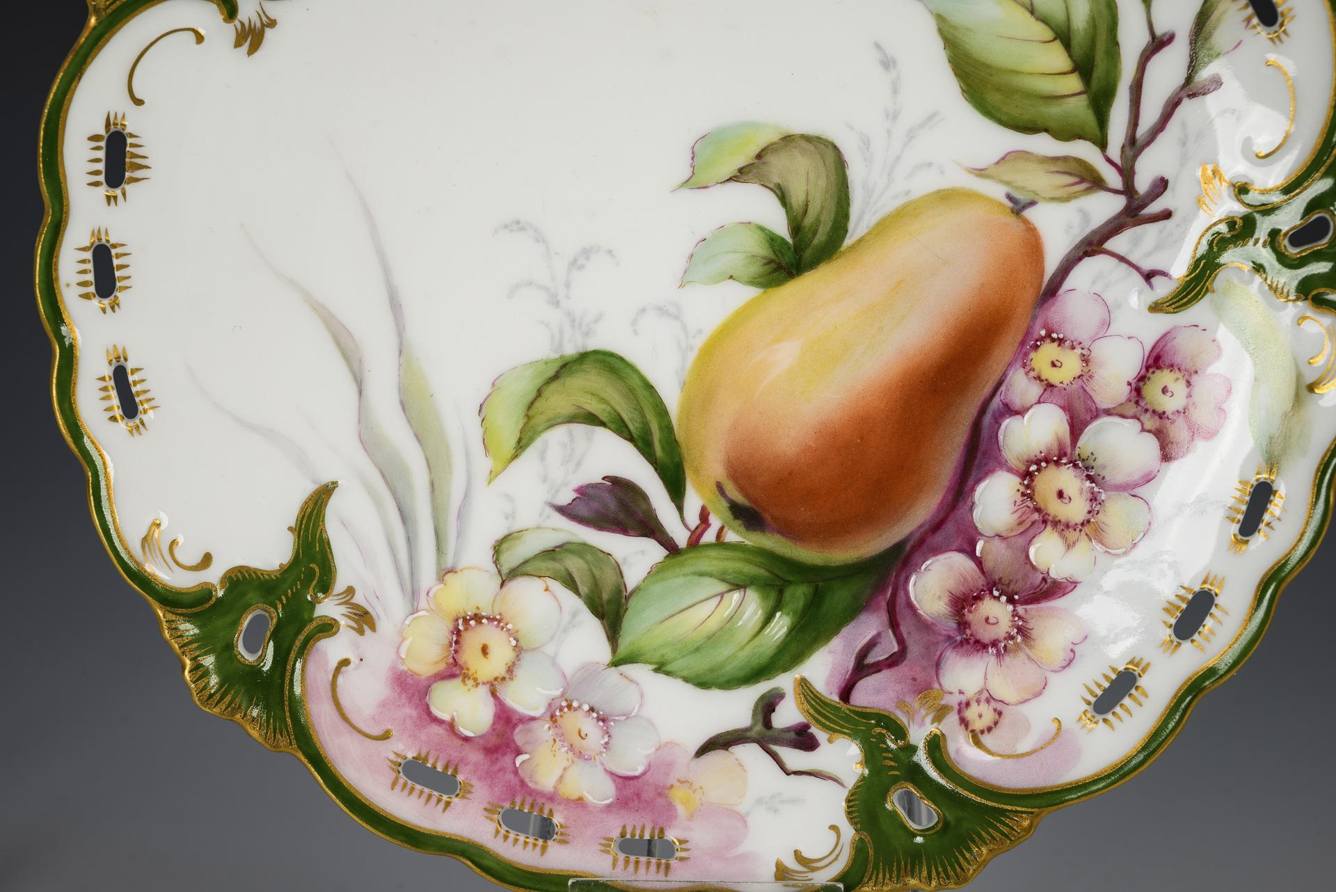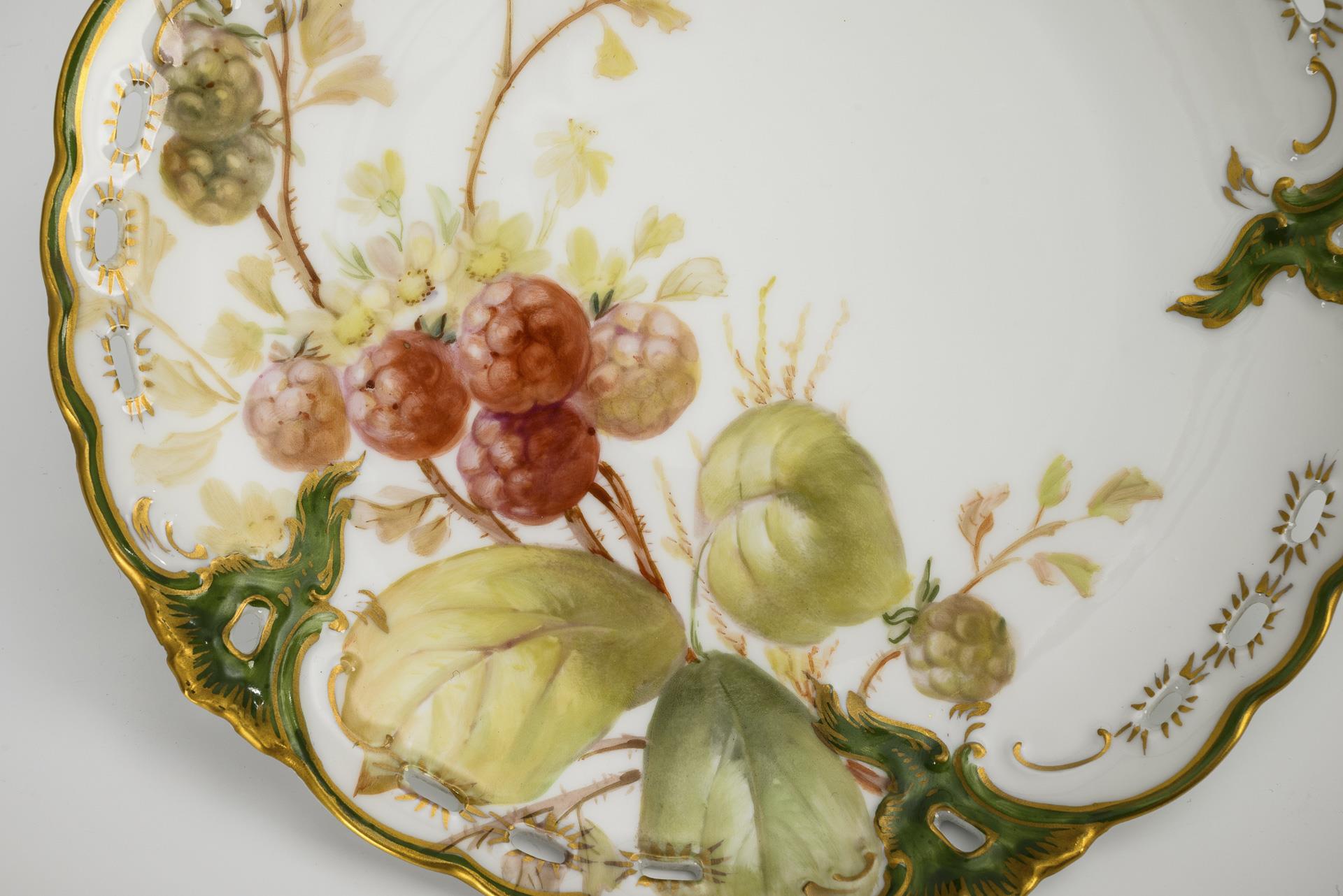 Plate with rocaille pierced rim, painted with fruit branches. 1x with rim hairline crack, 1x with rim chip on the underside.