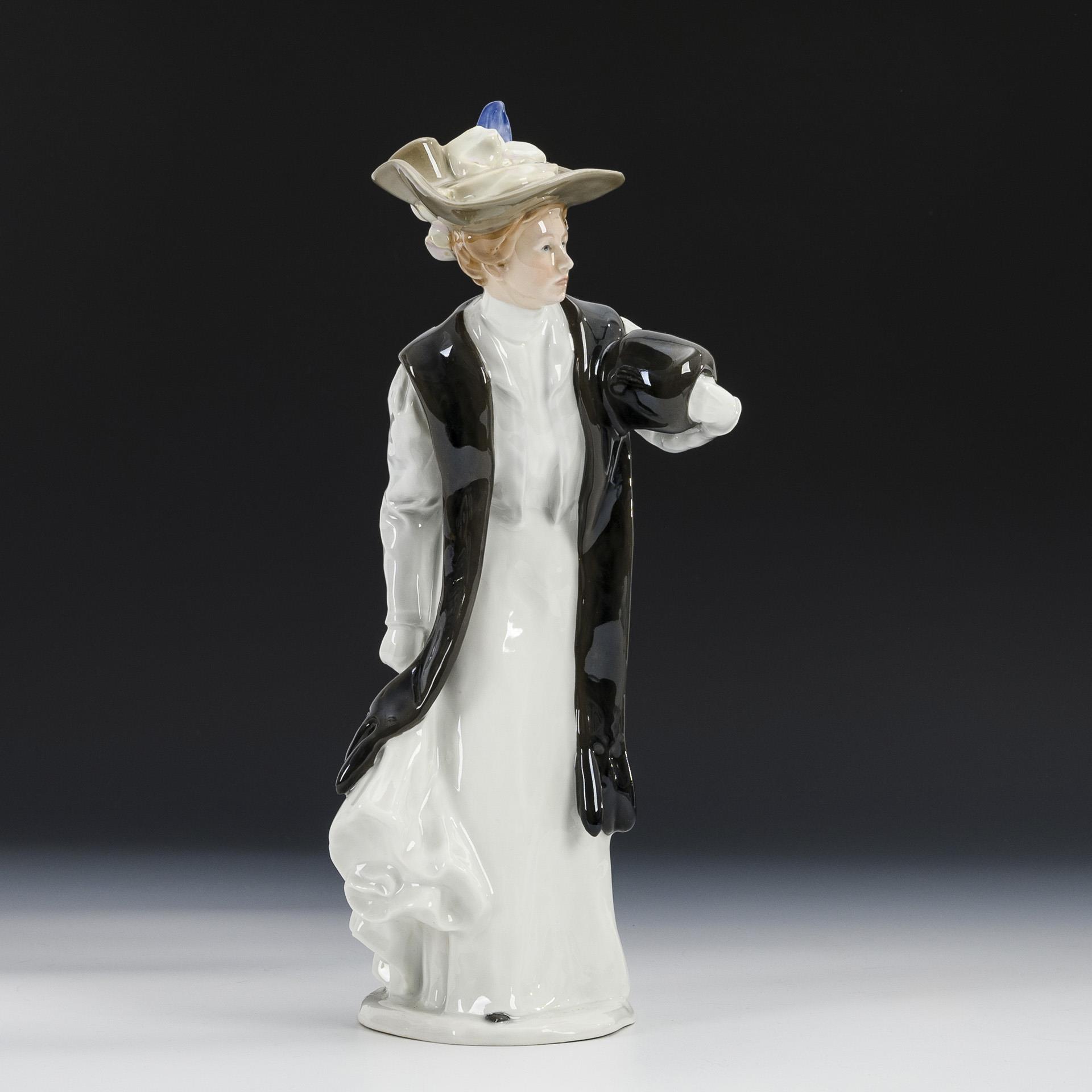 Elegant, standing lady with hat, fur and muff. Hat plume restored.