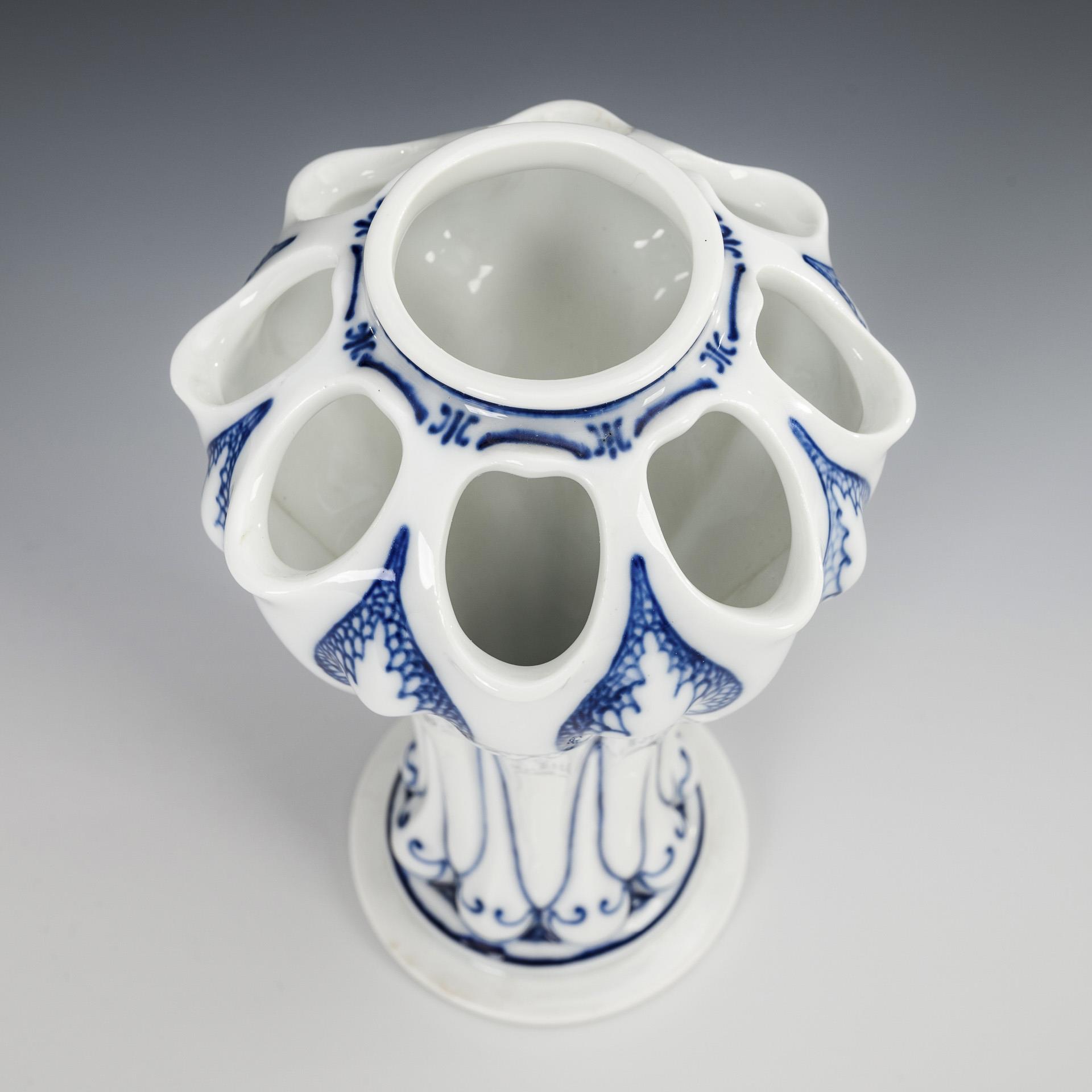 Eight-pass baluster vase with eight openings on the shoulder. Underglaze blue painted leaf decoration.