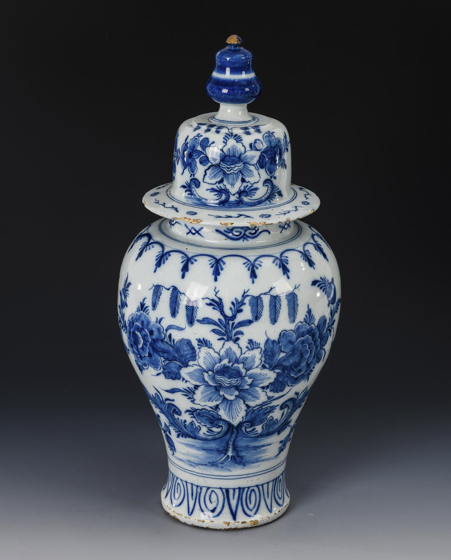 Baluster shape, bell-shaped lid with cone finial. Asianized blue painting with large flowers. Rims chipped, partly cracked and glued, glaze defects.