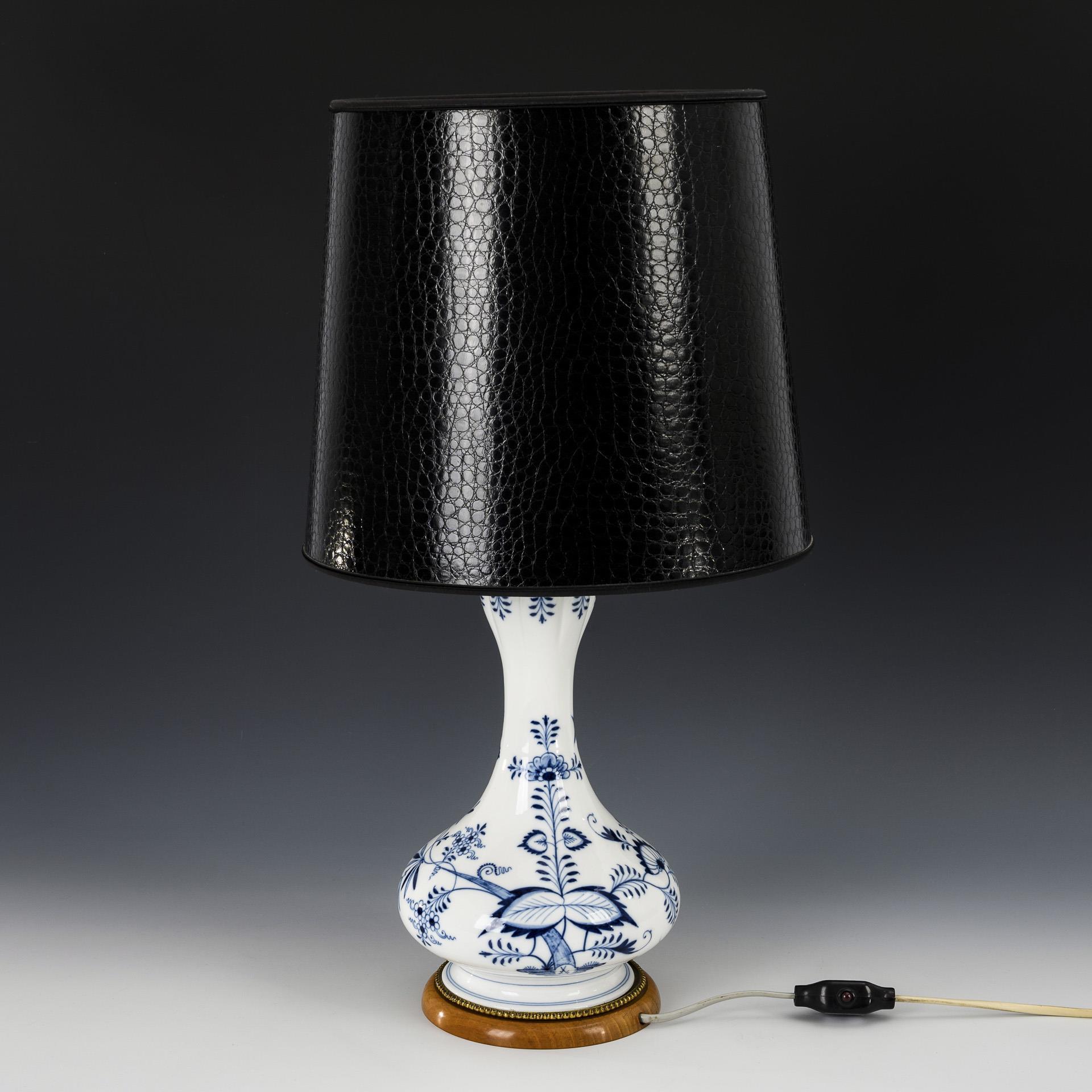 Pressed base with narrow neck, black plastic shade with gold-colored leather-look interior, wooden plinth. Electrified (function not tested).