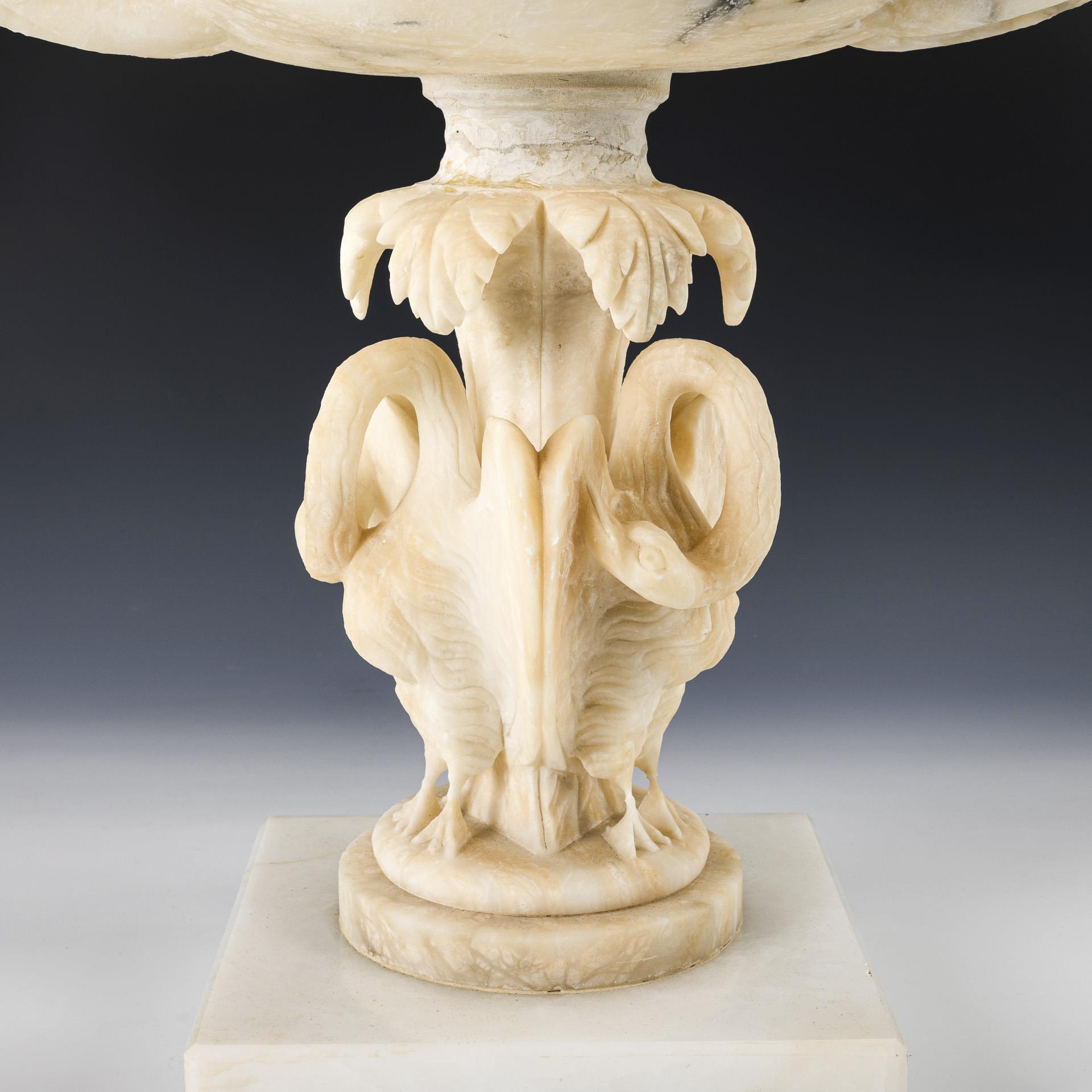 Alabaster, white marble plinth. Probably early 20th century. H 52 cm, Ø maximum 54 cm, Ø bowl interior 23 cm. 23.7 kg.